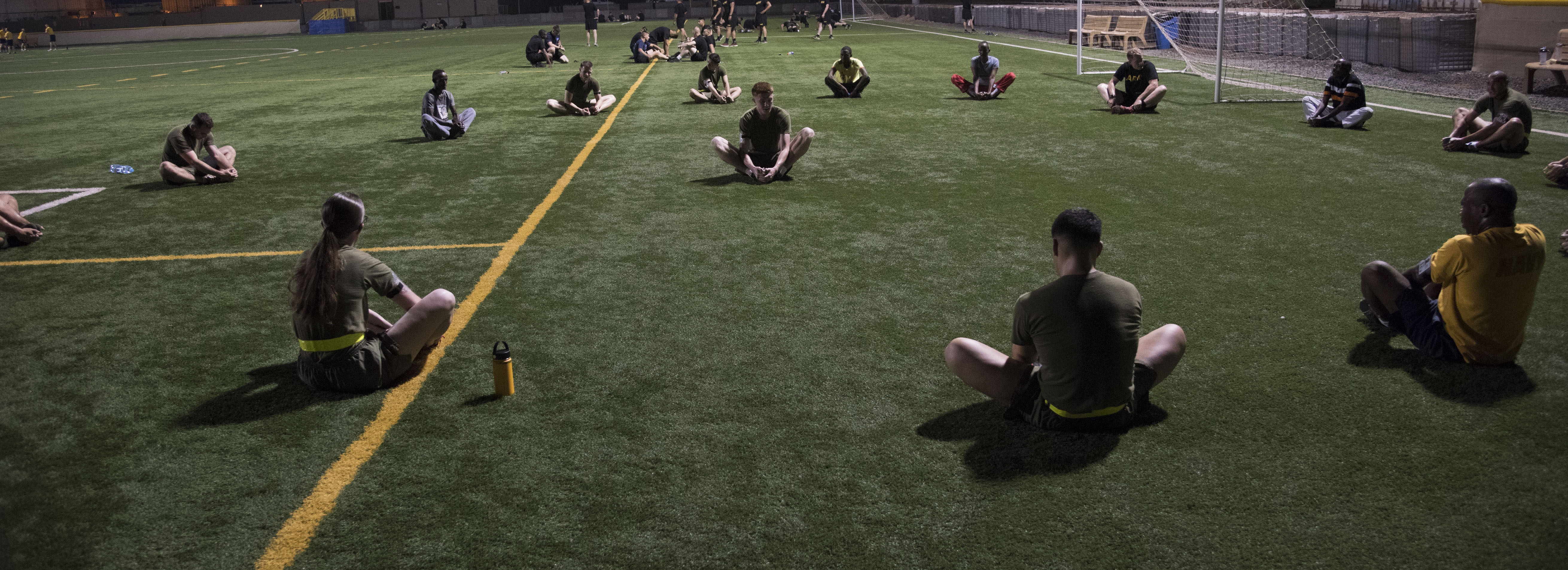 U.S. Marines, Sailors and Soldiers and Djiboutian military members stretch on the turf field of Camp Lemonnier, Djibouti, before beginning a physical fitness test as part of the Joint Corporals Course, hosted by Combined Joint Task Force – Horn of Africa, Jan. 9, 2018. The Joint Corporals Course is designed to provide junior service members with the knowledge and skills necessary to assume leadership roles of greater responsibility as a non-commissioned officer, as well as strengthen bonds between participating militaries. (U.S. Air National Guard photo by Staff Sgt. Allyson L. Manners)