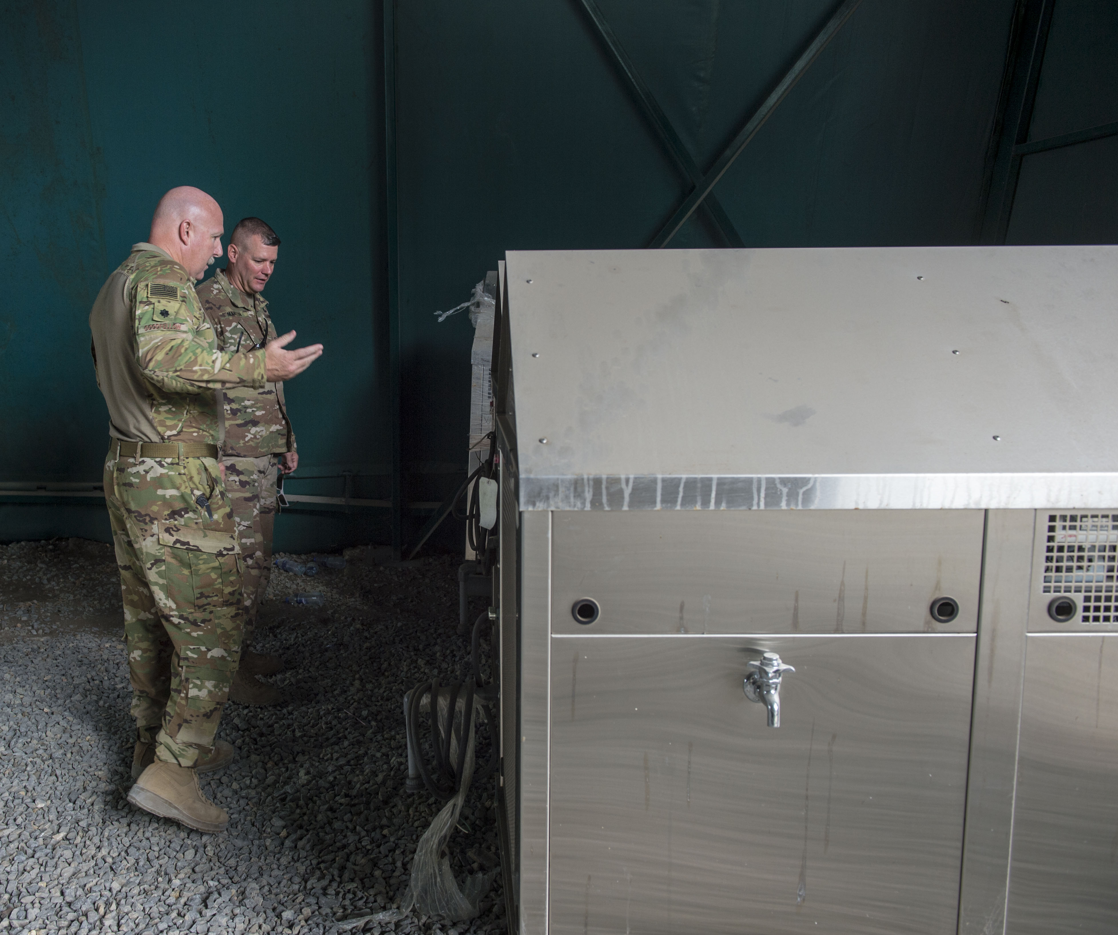 U.S. Air Force Lt. Col. Vance Goodfellow, left, 475th Expeditionary Air Base Squadron (EABS) commander, speaks with U.S. Army Lt. Col. Todd Martin, safety officer assigned to the Combined Joint Task Force - Horn of Africa (CJTF-HOA) Safety directorate, about water tanks during a battlefield circulation site visit at Camp Simba in Manda Bay, Kenya, Feb. 24, 2018. Camp Simba is currently operated by the 475th EABS, who fall under the 435th Air Expeditionary Wing, but the property hosts CJTF-HOA personnel and is in the CJTF-HOA area of operations. As such, the CJTF-HOA Safety and Inspector General directorates provide support to the service members, Department of Defense civilians, and local national contractors who work on the camp. (U.S. Air Force photo by Staff Sgt. Timothy Moore)