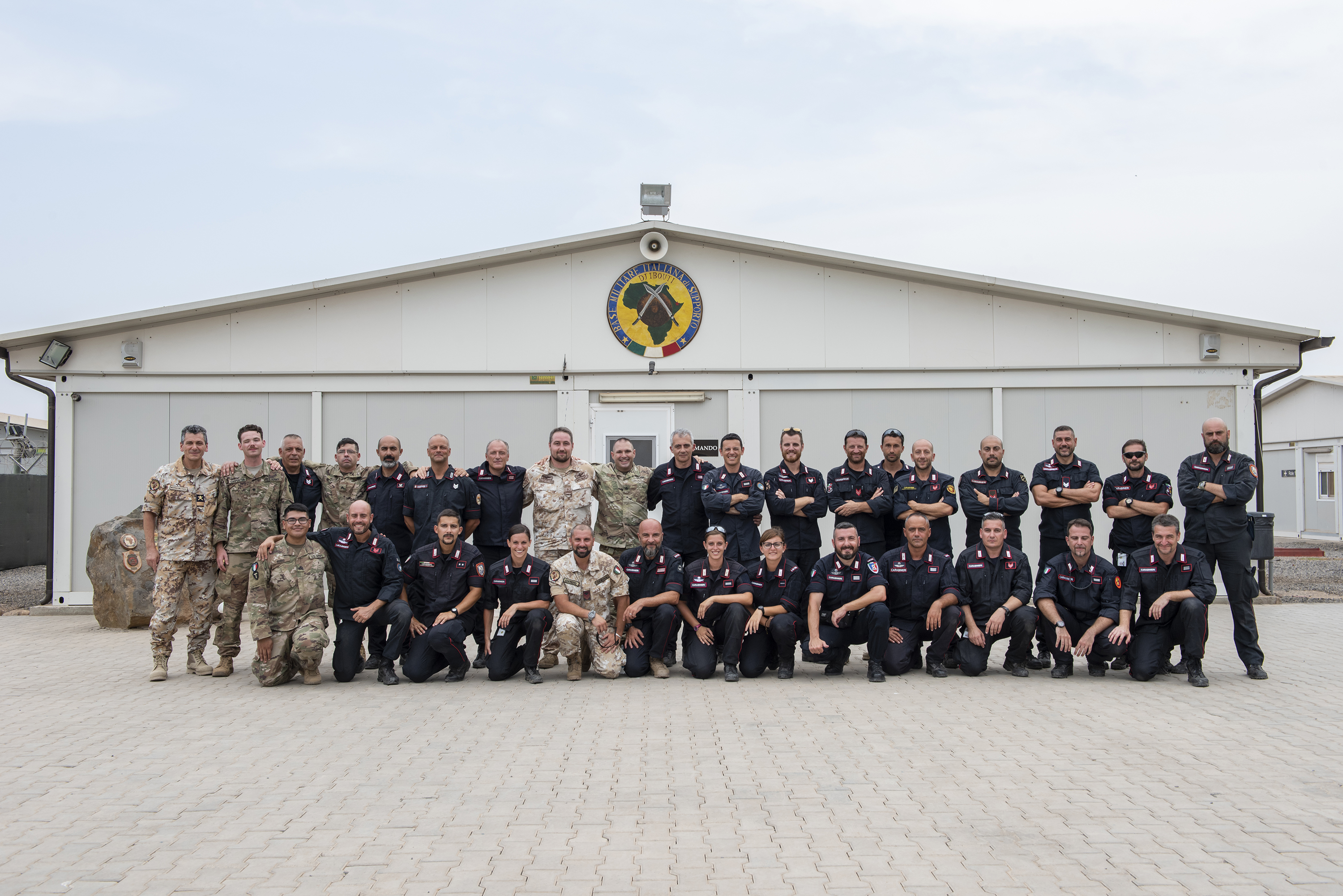 U.S. Soldiers with the 404th Civil Affairs Battalion Functional Specialty Team and the 3rd battalion, 144th Infantry Regiment, Texas Army National Guard pose for a class photo with Italian soldiers from the 1st Paratroopers Carabinieri Regiment, Tuscania, on Base Militar Italiano de Supporte, Djibouti, April 28, 2018. The soldiers taught a combat lifesaver course to 33 students over a five-day period. (U.S. Air National Guard photo by Master Sgt. Sarah Mattison)