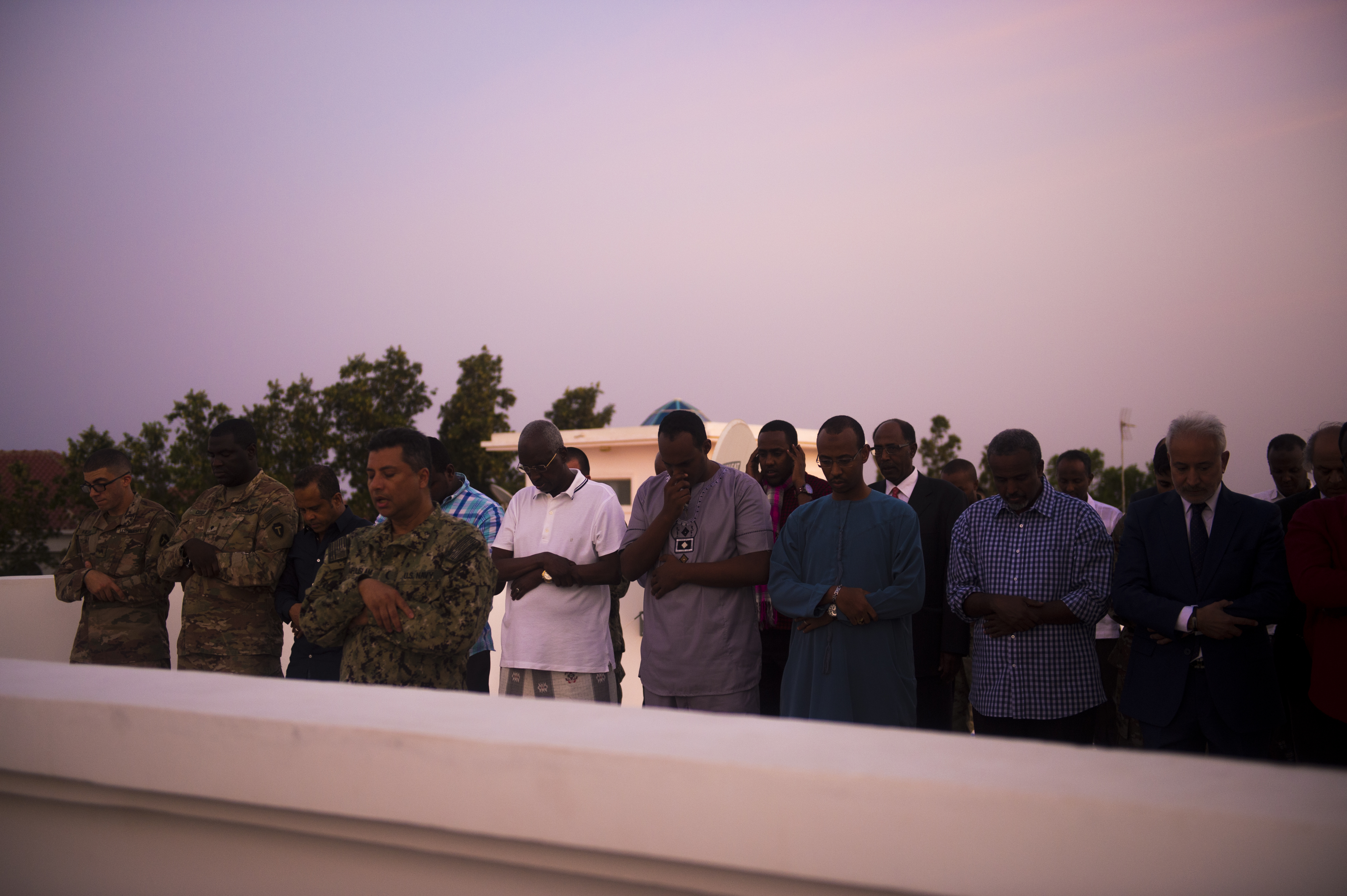 U.S. Navy Cmdr. Abduhena Saifulislam, chaplain, Africa Command, leads Muslims in prayer as the sun sets, beginning an Iftar at the residence of the U.S. Ambassador to the Republic of Djibouti, Larry André, May 22, 2018. André opened his home to celebrate two Iftars, one run by the Defense Attaché Office for senior Diboutian Military and security leaders, the second for senior government, diplomatic, and business leaders. (U.S. Air Force photo by Senior Airman Scott Jackson)