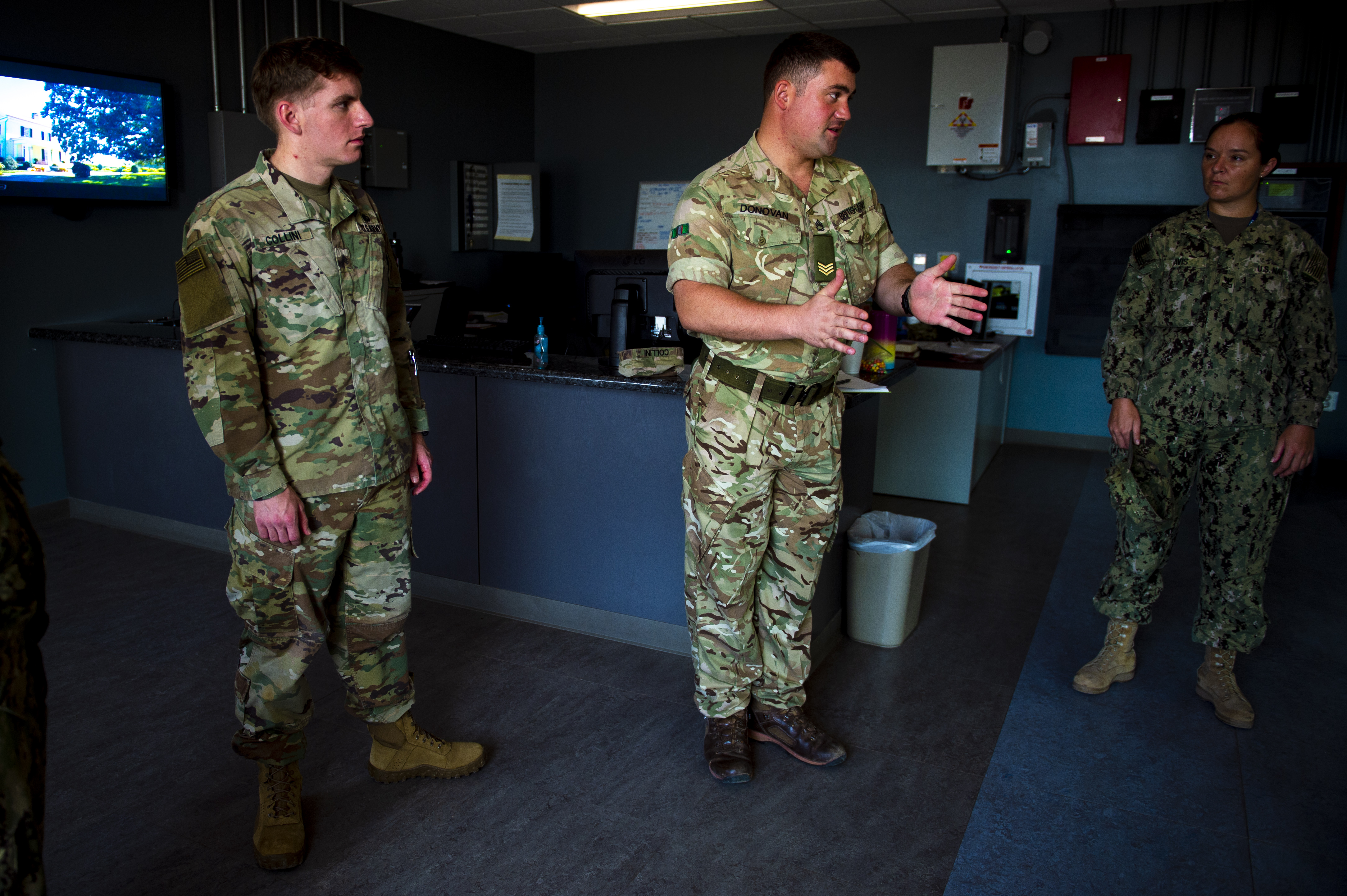 British Army Sgt. David Donovan leads a color detail for morning colors on Camp Lemonnier, Djibouti, August 25, 2018. Donovan volunteered to lead the detail to learn more about America military tradition. He is currently serving the United States as an exchange officer. (U.S. Air Force photo by Senior Airman Scott Jackson)