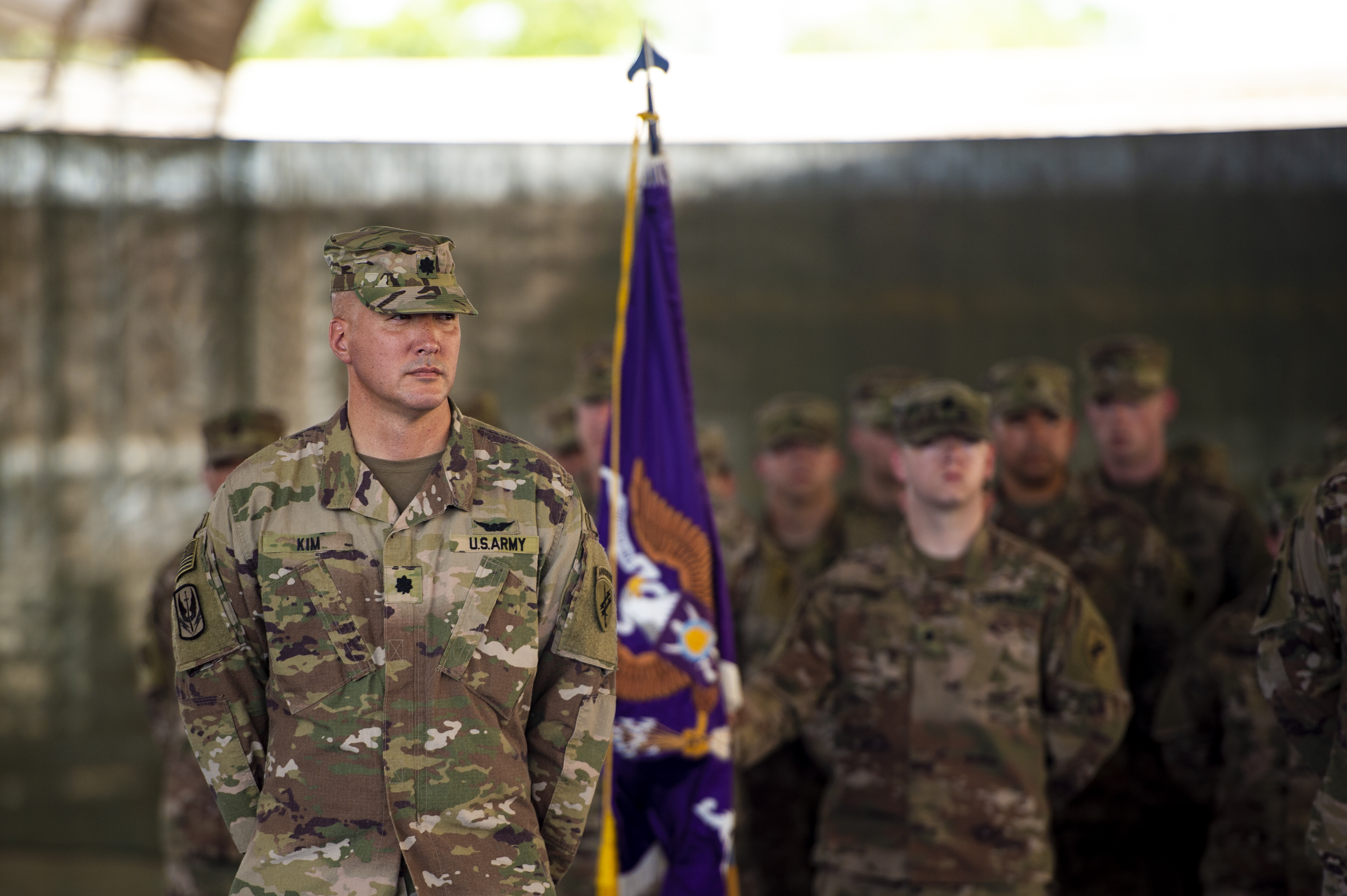 U.S. Army Lt. Col. Scott Kim, commander 403rd Civil Affairs Battalion, stands at parade rest after receiving the guide-on during a transfer of authority ceremony on Camp Lemonnier, Djibouti, Oct. 13, 2018. The 404th CA Battalion transferred its authority to the 403rd CA Battalion, who will now continue the mission throughout the Horn of Africa. (U.S. Air Force photo by Senior Airman Scott Jackson)