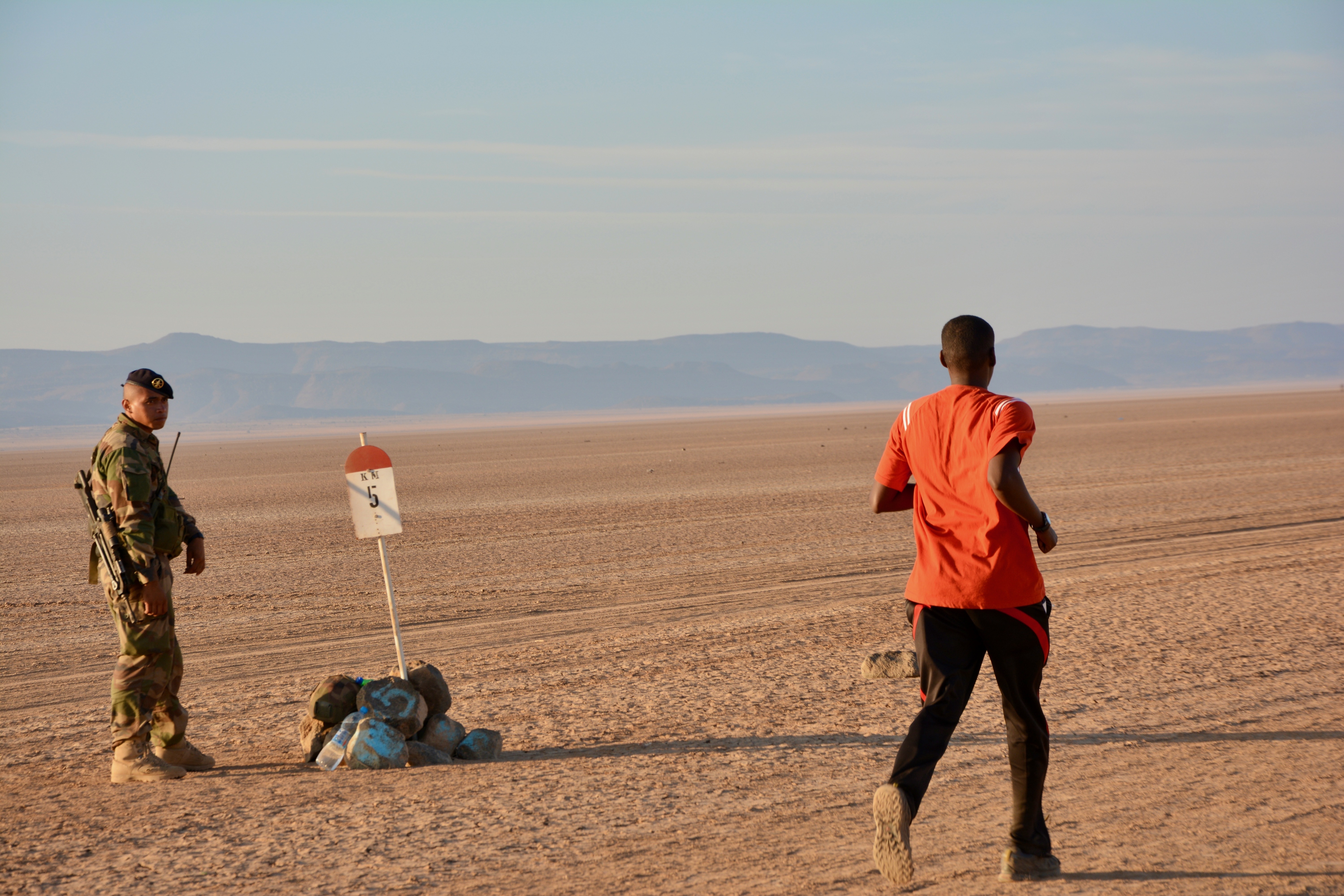 A runner approaches a kilometer marker during a 15-kilometer run through the Grand Bara Desert in Djibouti. Hosted by the French Foreign Legion, nearly 200 members of Combined Joint Task Force – Horn of Africa ran alongside 2,500 Djiboutian, Chinese, and coalition service members and civilians during the race across a stretch of Djibouti’s Grand Bara Desert, Dec. 13. (U.S. Army photo by Capt. Olivia Cobiskey)