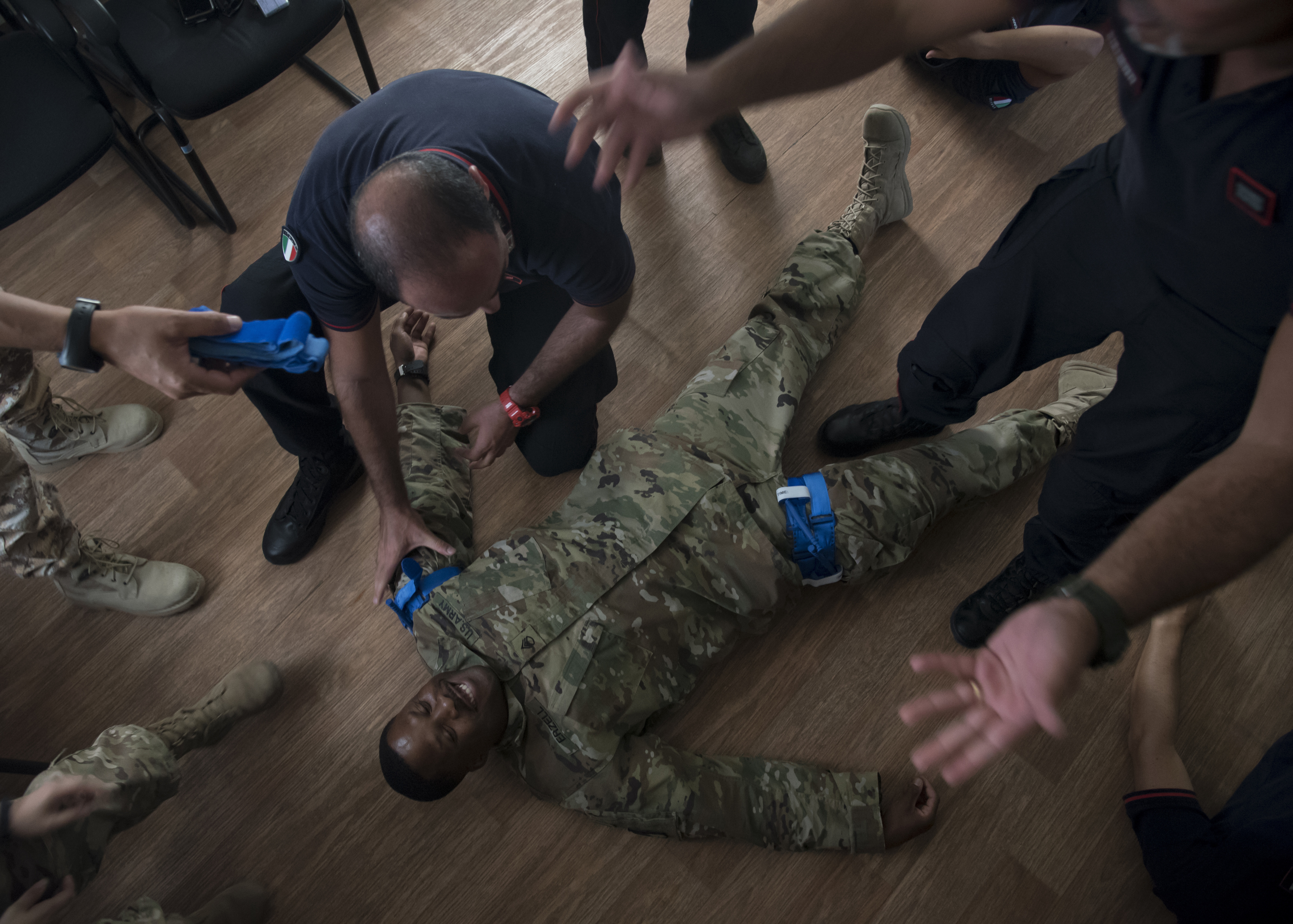 U.S. Army Staff Sgt. Duan Erzell, a communication’s specialist with the 403rd Civil Affairs (CA) Battalion, participates in a tourniquet application demonstration as a simulated casualty during a Combat Lifesaver Course (CLS) at Base Militar Italiano de Supporte, Djibouti, Jan. 15, 2019. Proper tourniquet application is a primary focus of the CLS, a course medics from the 403rd CA Functional Specialty Team recently conducted for members of Base Militar Italiano de Supporte. (U.S. Air Force photo by Senior Airman Kirsten Brandes)