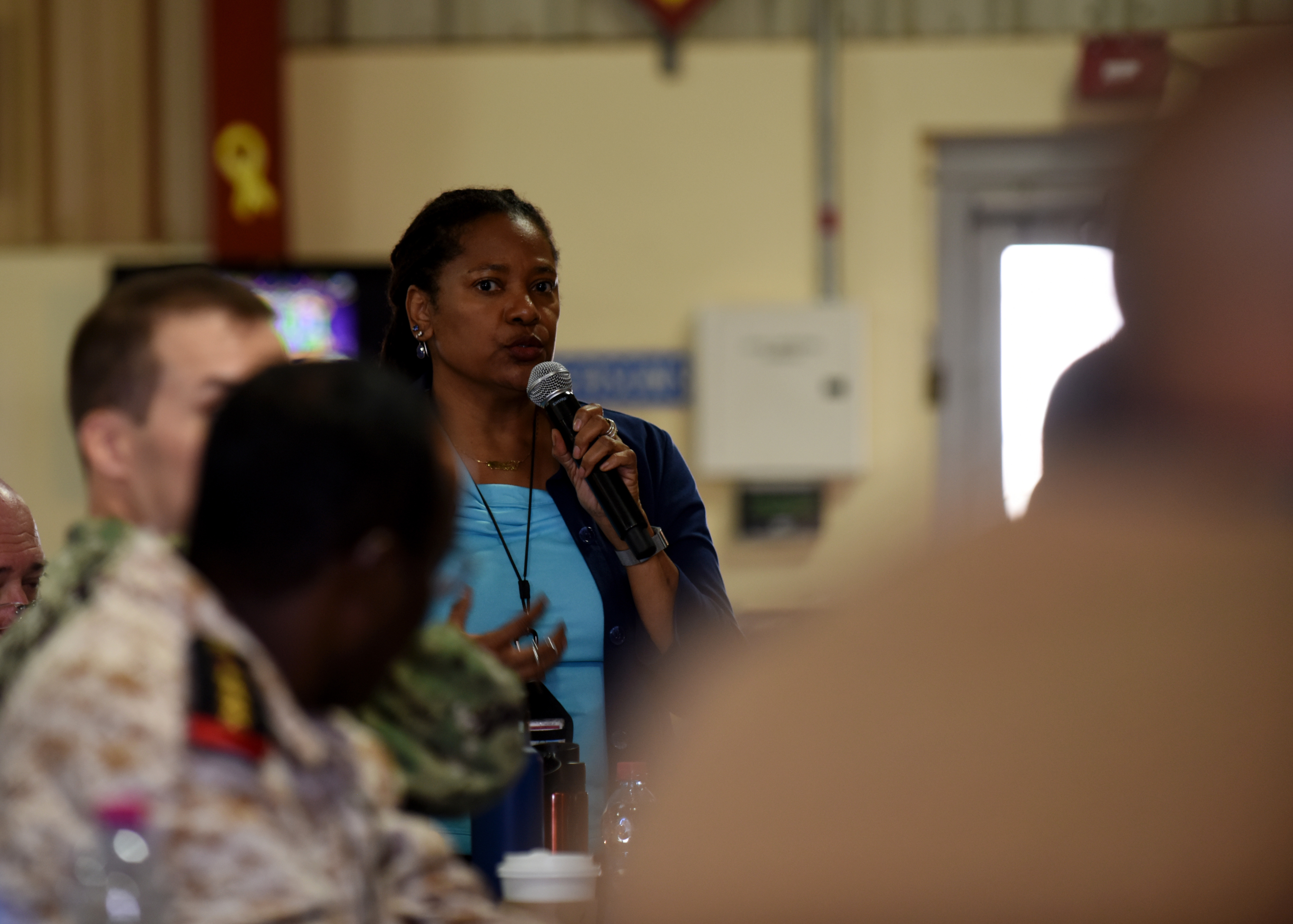 Rabihah Mateen, U.S. Agency International Development country representative for Djibouti, speaks during an Emergency Response Information Exchange multinational discussion, Feb. 12, 2019 at Camp Lemonnier, Djibouti. The three-day discussion included representatives from the U.S., Japan, Germany, Italy, France, Spain and Djibouti, who identified various capabilities each nation can offer during the event of a natural disaster in Djibouti, including communication equipment, emergency vehicles and medical support. (U.S. Air Force photo by Staff Sgt. Franklin R. Ramos)