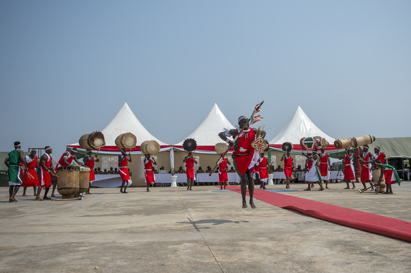 A member of the Royal Drummers of Burundi performs with his spear at the graduation of the Burundi National Defence Force Senior Command and Staff College in Bujumbura, Burundi, July 19, 2019. The Royal Drummers of Burundi has conducted the same performance for centuries, as their techniques and traditions are passed down from father to son. (U.S. Air Force Photo by Senior Airman Codie Trimble)