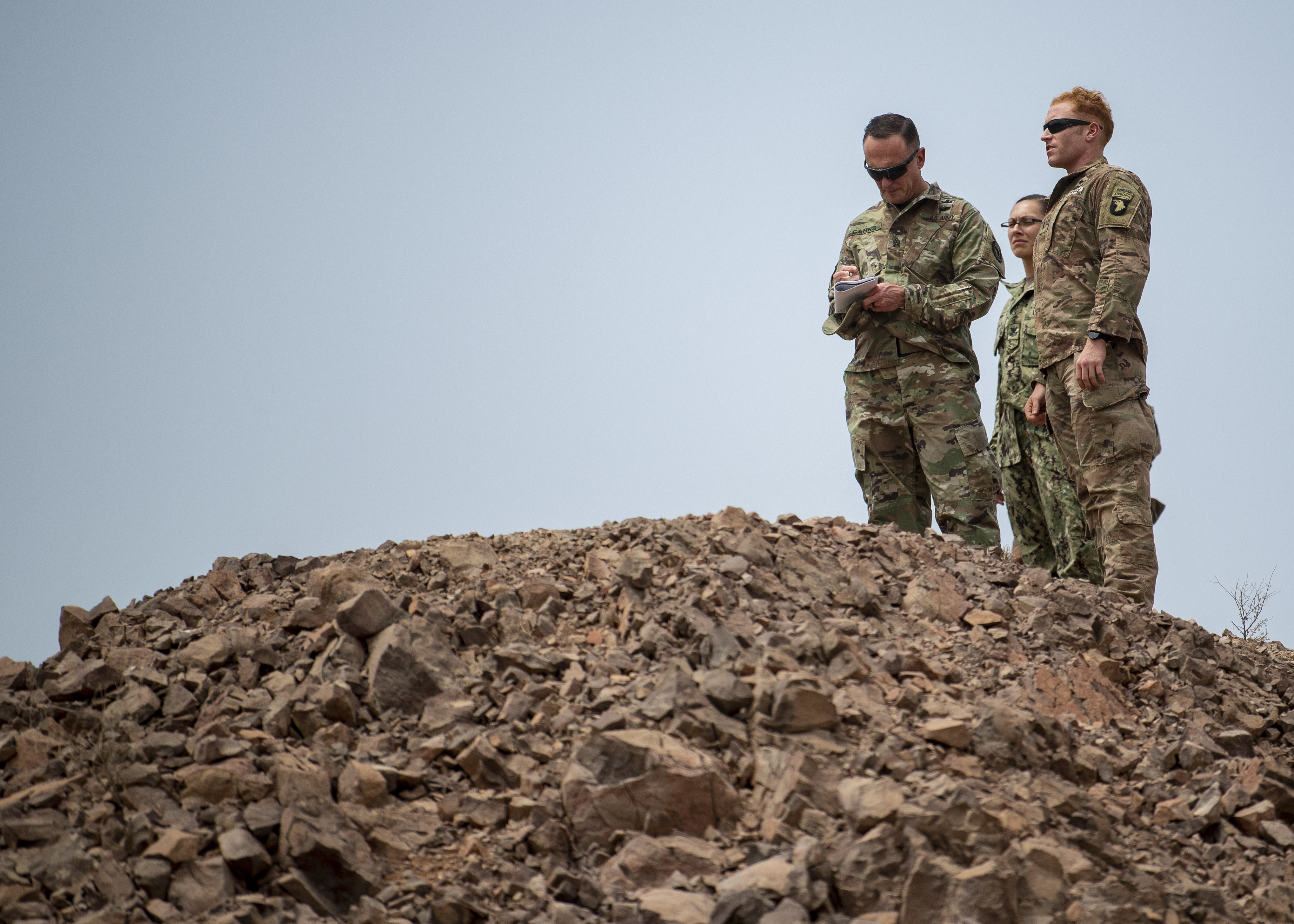 U.S. Army Command Sgt. Maj. Shawn Carns, command senior enlisted leader (SEL), Combined Joint Task Force-Horn of Africa (CJTF-HOA), takes notes while being briefed by U.S. Army First Lt. Nicholas Noga, platoon leader, 101st Division, 1st Battalion, 26th Infantry Regiment, Task Force Warrior, assigned to CJTF-HOA, during his battlefield circulation visit at Arta Range, Djibouti, Aug. 26, 2019. Battlefield circulation visits allow Carns to meet with units within CJTF-HOA’s combined joint operations area for familiarization and rapport-building. (U.S. Air Force photo by Staff Sgt. J.D. Strong II)
