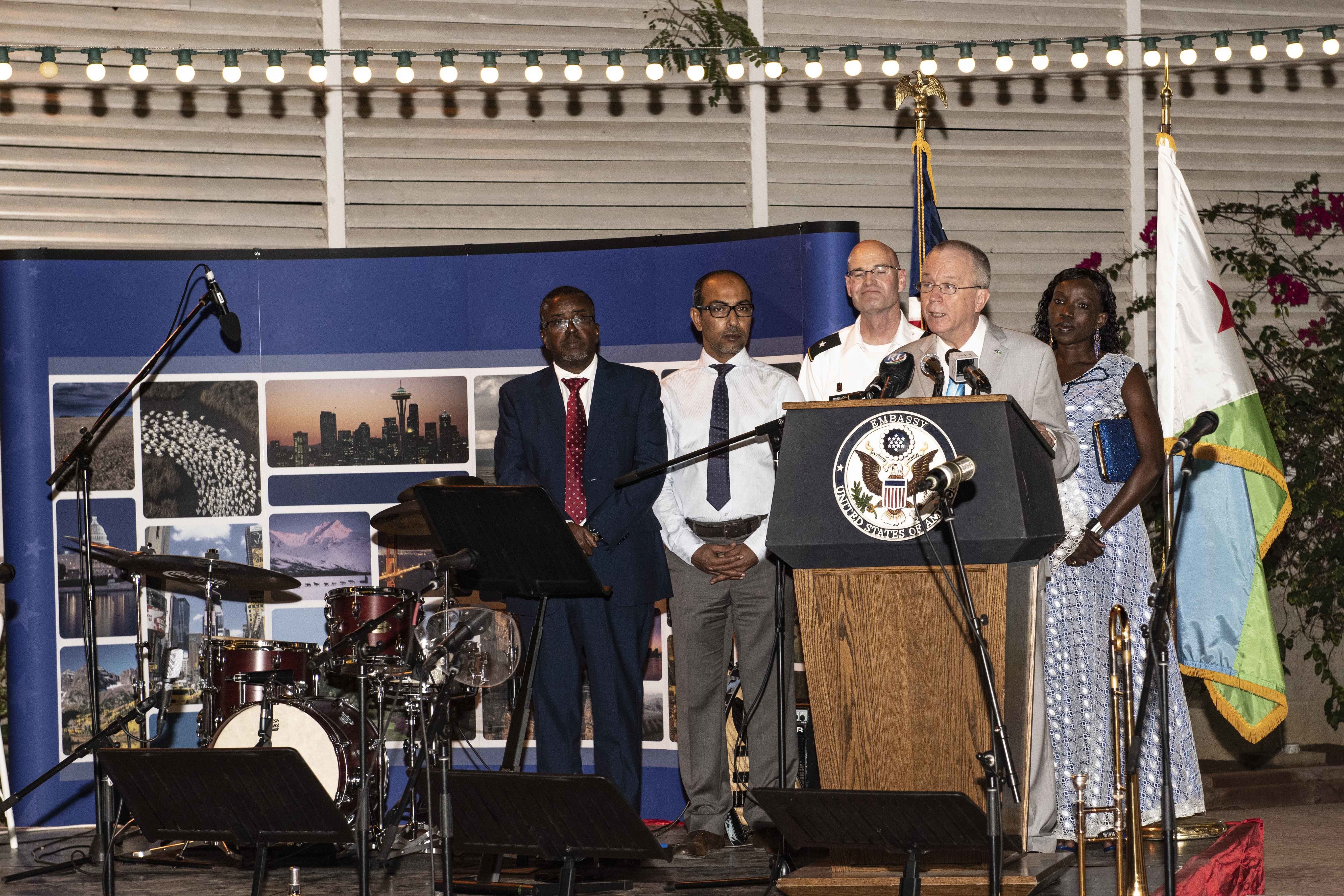 DJIBOUTI CITY, Djibouti - U.S. Ambassador to Djibouti, Larry André, speaks during National Day in Djibouti City, Djibouti, Feb. 11, 2020. The event commemorates the 244th year of U.S. independence and is typically held each spring to avoid the summer heat. Military personnel from Combined Joint Task Force – Horn of Africa (CJTF-HOA), Camp Lemonnier Djibouti (CLDJ), coalition partners, guests, and U.S. Embassy staff attended the celebration. (U.S. Navy photo by Chief Mass Communication Specialist Elisandro T. Diaz)