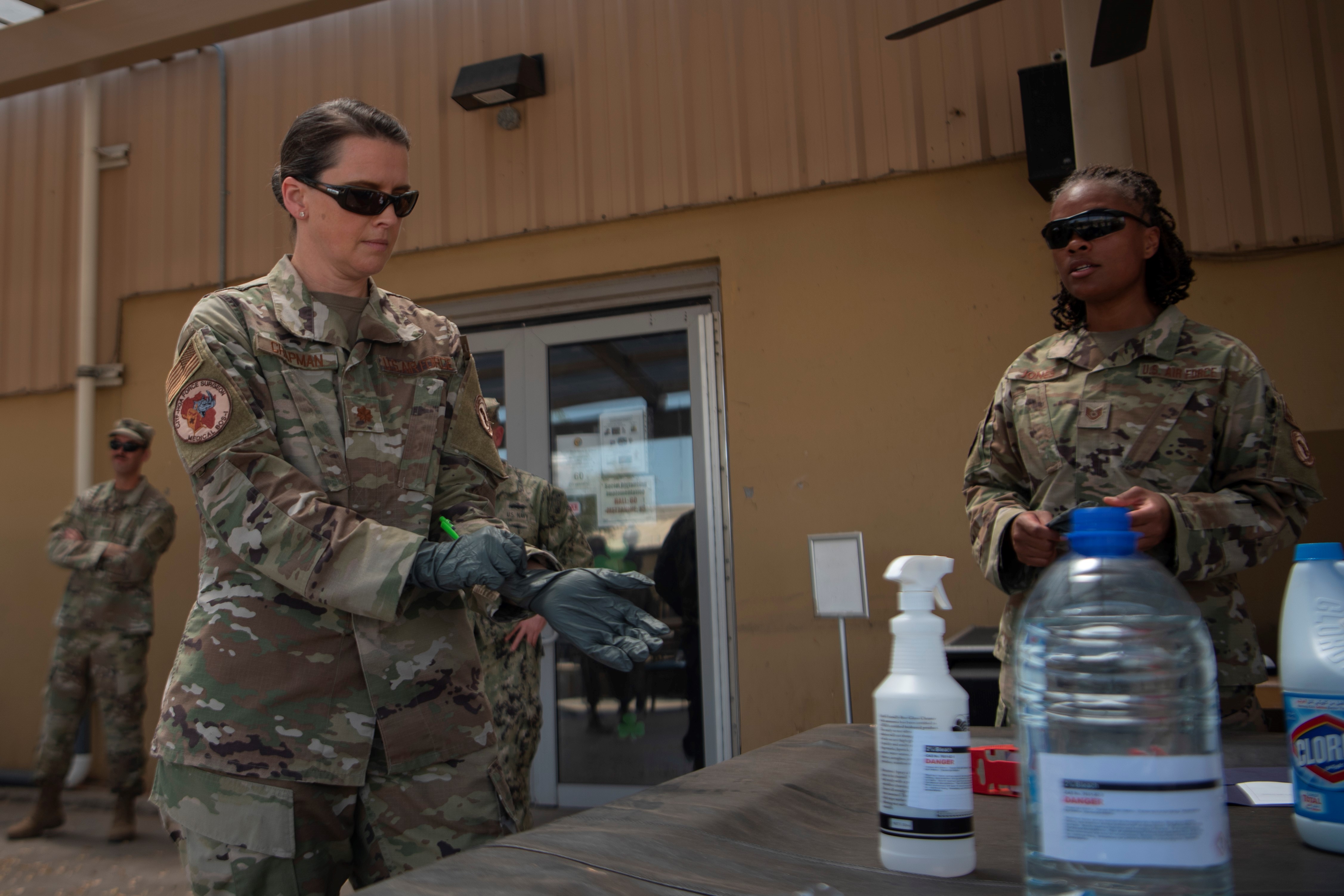 U.S. Air Force Maj. Leah Chapman (left), Combined Joint Task Force-Horn of Africa environmental and public health officer, puts on rubber gloves before mixing bleach with water to create a cleaning solution during a training session for a high-traffic area disinfect team at Camp Lemonnier, Djibouti, March 27, 2020. The team learned how COVID-19 and other viruses can live on non-porous surfaces, such as metal, glass, plastic, and laminated surfaces, for several days. The teams are now disinfecting high traffic locations and objects like water filling stations, benches and doors at common use facilities frequently touched by multiple individuals to prevent illness. (U.S. Air Force photo by Senior Airman Gage Daniel)