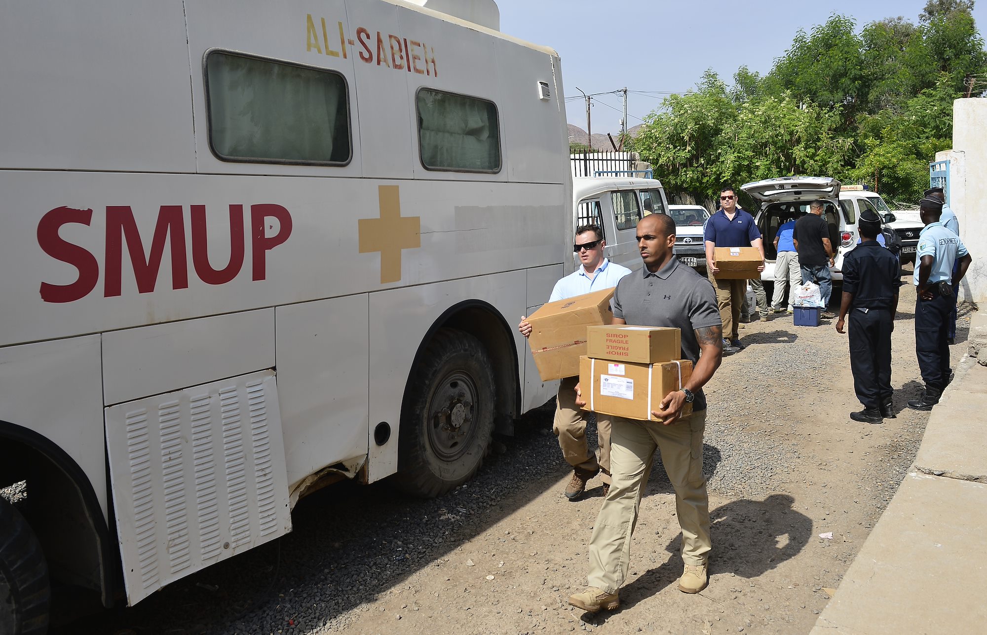 Members of the U.S. Army’s 404th Civil Affairs Battalion, assigned to Combined Joint Task Force-Horn of Africa, unload medical supplies at Ali Sabieh Medical Clinic in Djibouti, Africa, Sept. 12, 2015. The 404th CA BN partnered with Djibouti’s Ministry of Health to host a Medical Civic Action Program outreach event. They provided an obstetrician-gynecologist, pediatrician, dentist and ophthalmologist for the rural people. (U.S. Air Force photo by Senior Airman Nesha Humes)