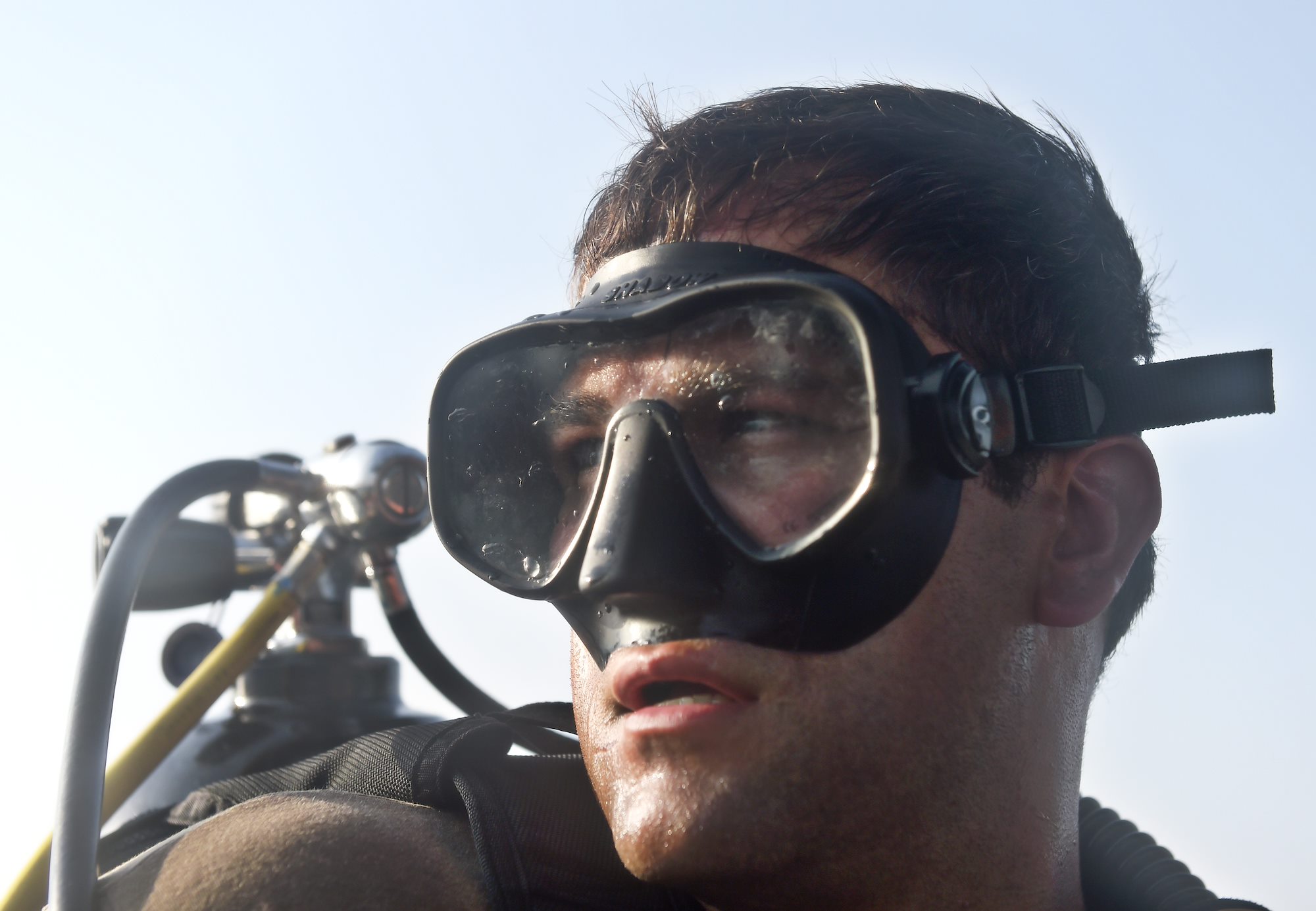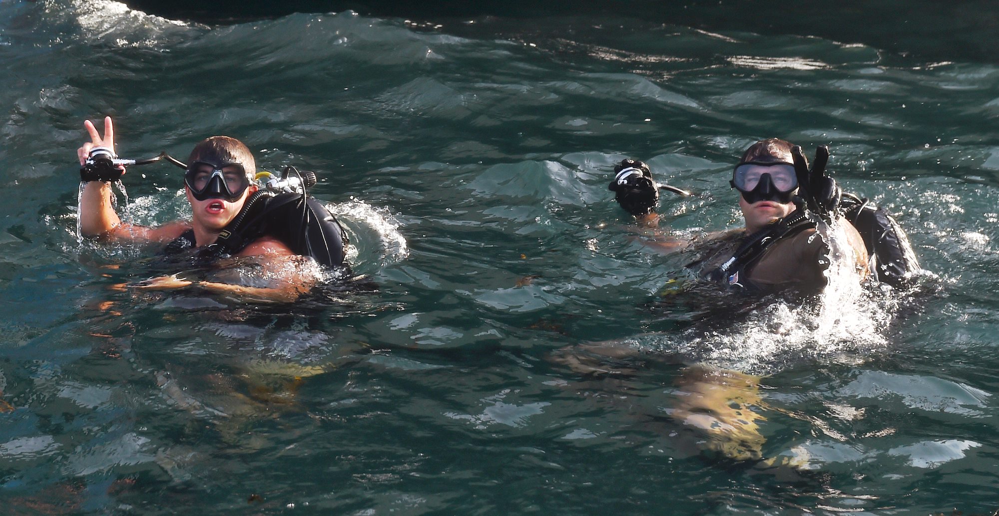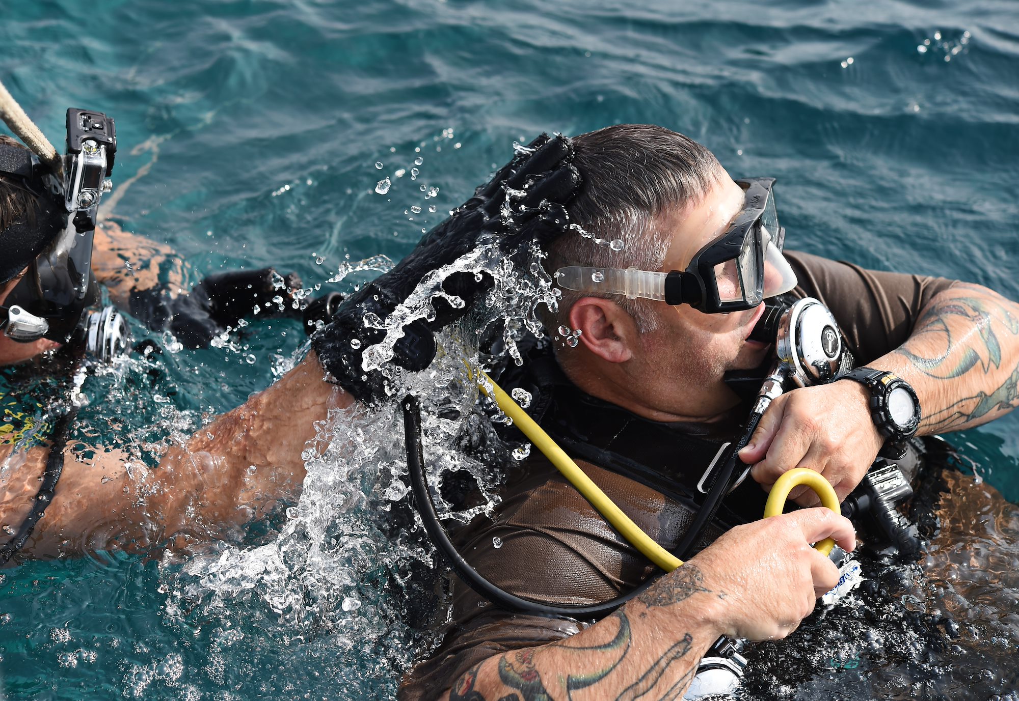 U.S. Navy Explosive Ordnance Disposal technicians, assigned to Combined Joint Task Force-Horn of Africa, operate off the coast of Djibouti, Africa, during routine anti-terrorism force protection dives. EOD technicians are trained to disarm explosive devices and clear underwater obstructions.