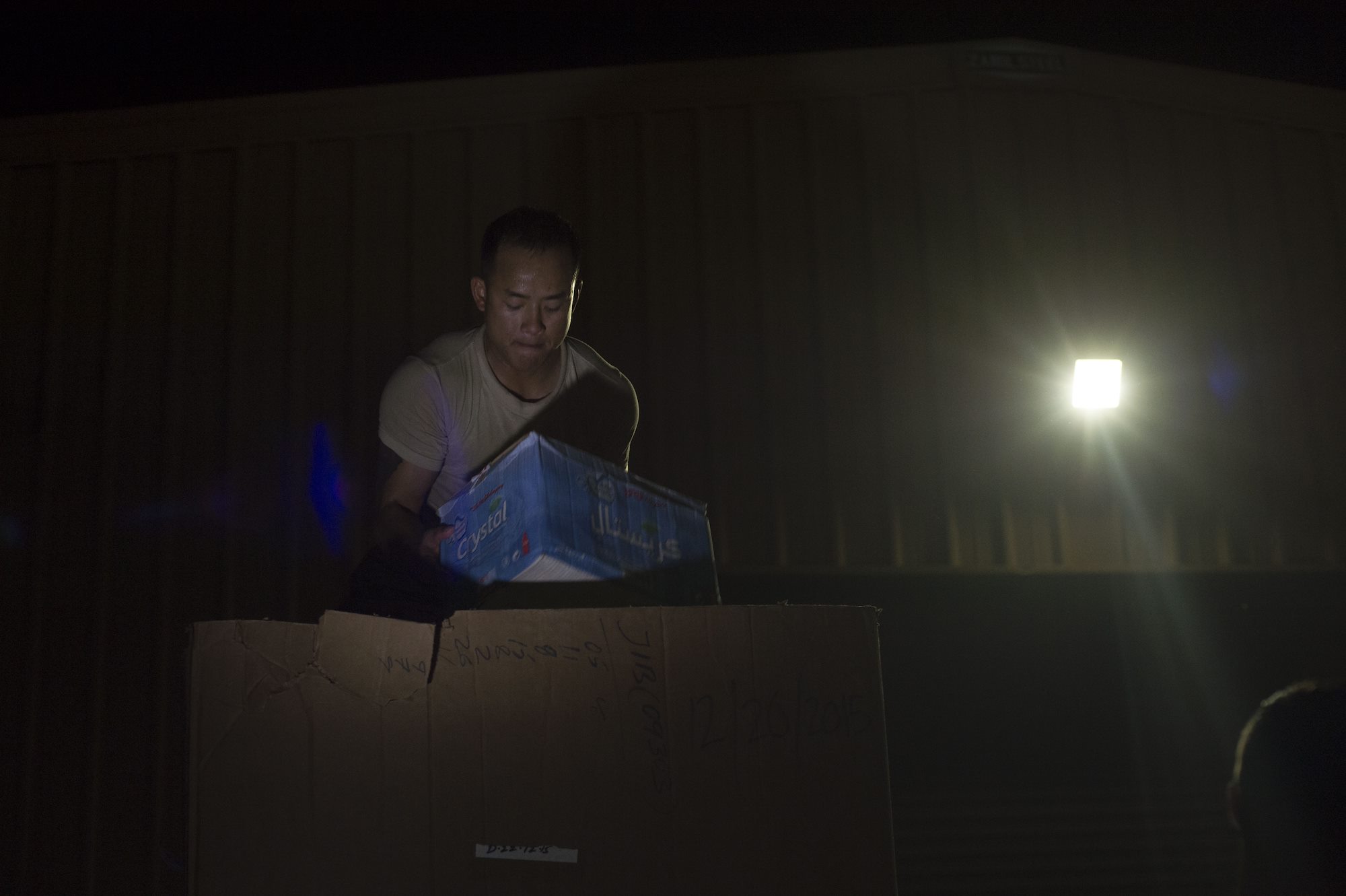U.S. Army Spc. Tien Do, an East African Response Force member, packs cases of water to forward deploy during an EARF exercise May 27, 2016, at Camp Lemonnier, Djibouti. The EARF serves as a quick reaction force and is an asset to bring stability to the East Africa region. (U.S. Air Force photo by Staff Sgt. Eric Summers Jr.)