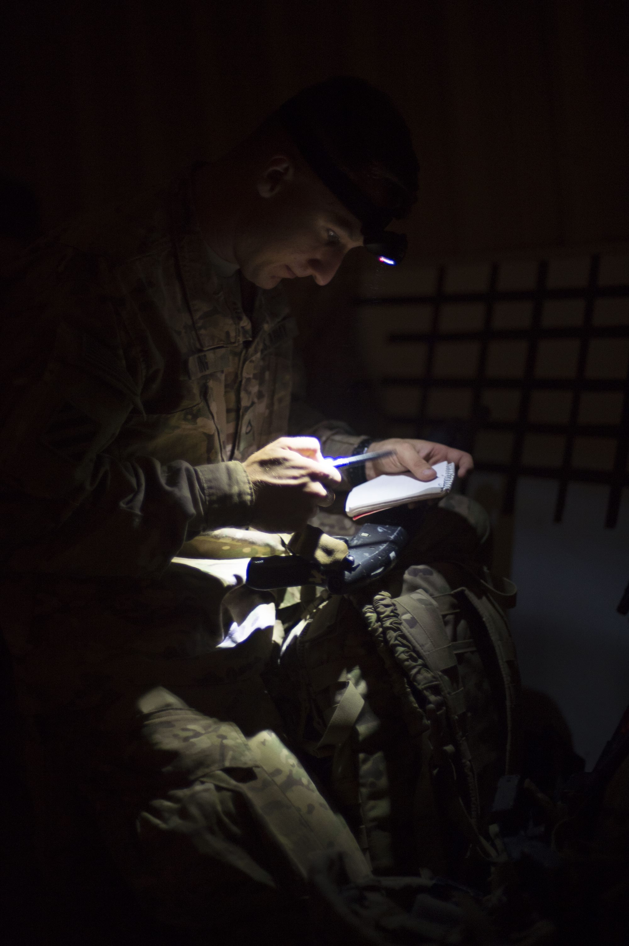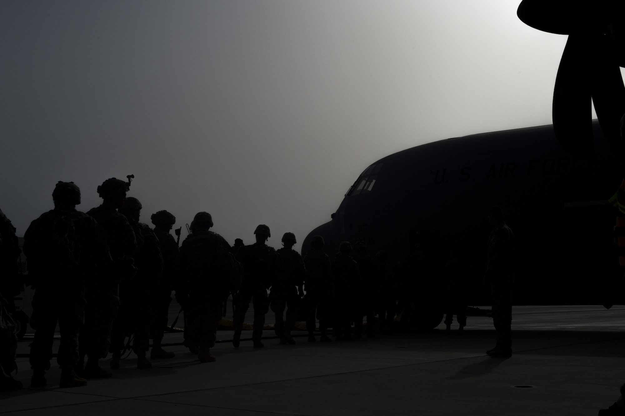 U.S. Army Sgt. 1st Class Raul Lopez, East African Response Force, takes accountability as Soldiers board a U.S. Air Force C-130J Hercules May 27, 2016, at Camp Lemonnier, Djibouti. Composed primarily of Soldiers, the EARF functions as a joint response unit, employing troops from across the services to accomplish the mission. (U.S. Air Force photo by Staff Sgt. Eric Summers Jr.)