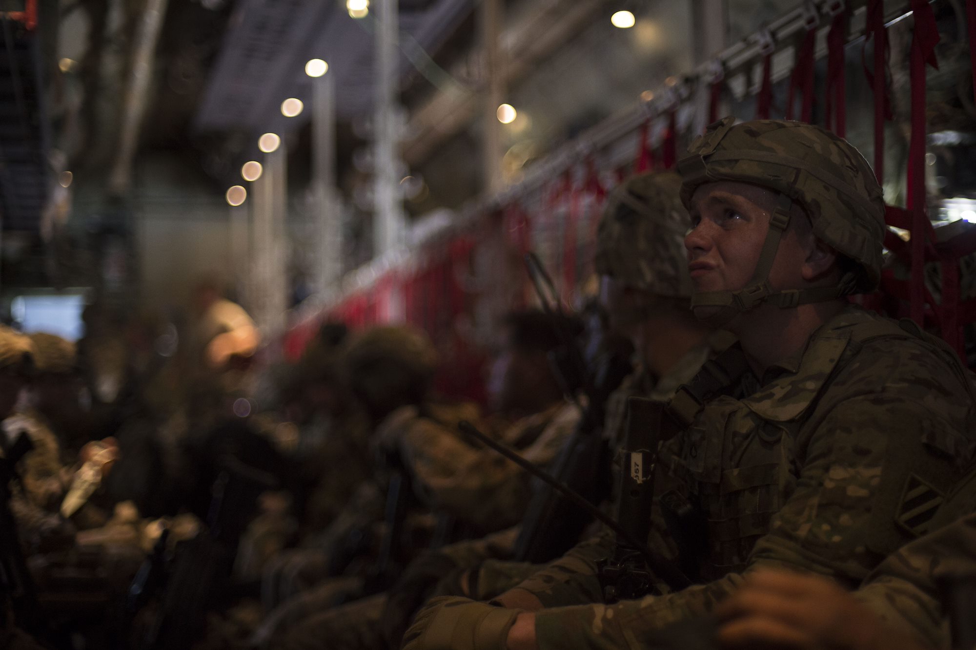 U.S. Army Pfc. Cory Middleton, an East African Response Force member, prepares to fly inside a C-130J Hercules during an EARF validation exercise May 27, 2016, at Camp Lemonnier, Djibouti. The goal of the exercise was to test Combined Joint Task Force-Horn of Africa’s ability to rapidly deploy forces. (U.S. Air Force photo by Staff Sgt. Eric Summers Jr.)