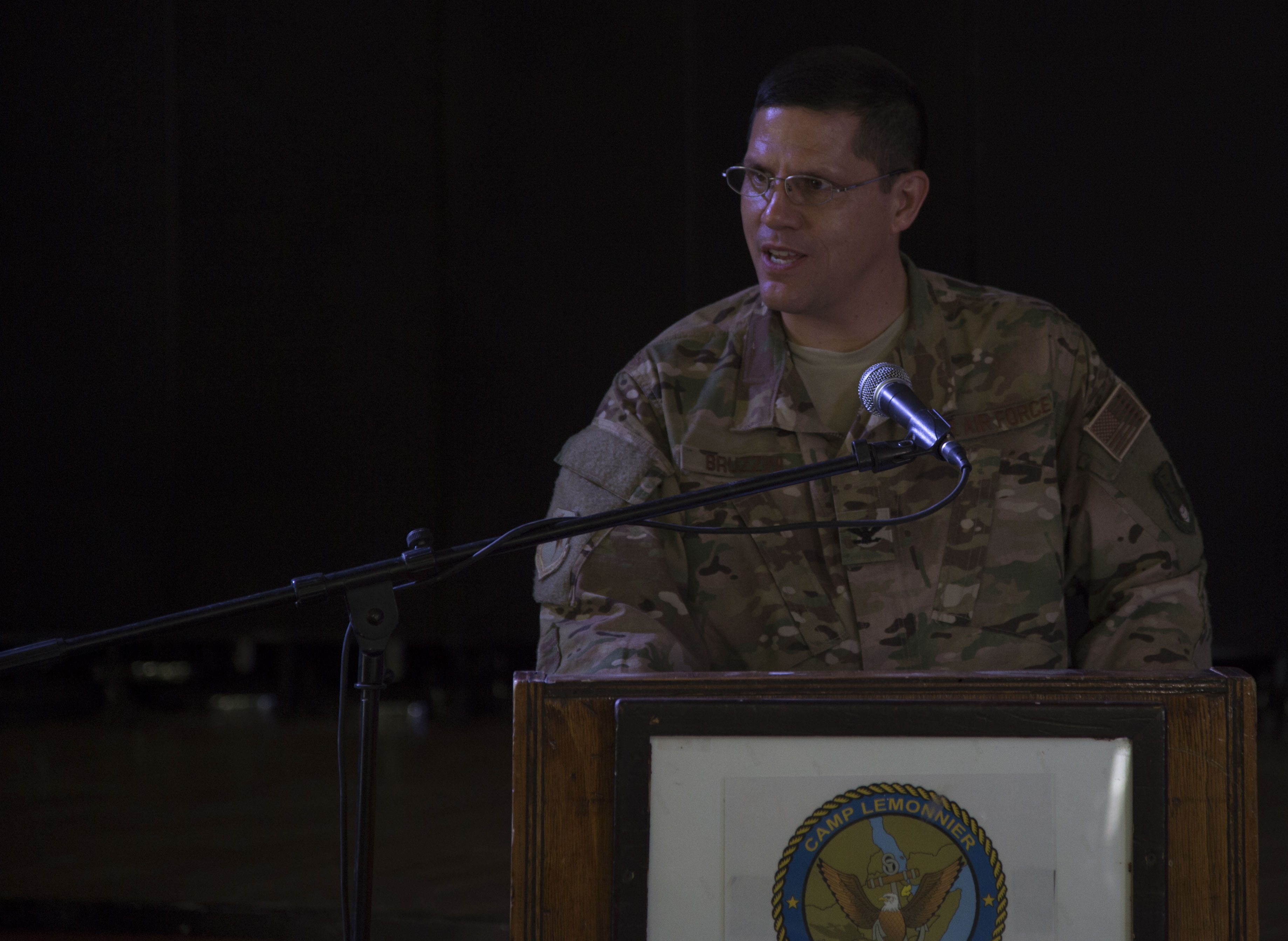 U.S. Air Force Col. Michael Bruzzini, 449th Air Expeditionary Group incoming commander, makes his first remarks to his new unit during the 449th AEG Change of Command ceremony June 6, 2016, at Camp Lemonnier, Djibouti. Bruzzini comes to the 449th AEG from the Office of the Assistant Secretary of the Air Force for Financial Management and Comptroller, where he served as the deputy assistant secretary for programs. (U.S. Air Force photo by Staff Sgt. Eric Summers Jr.)