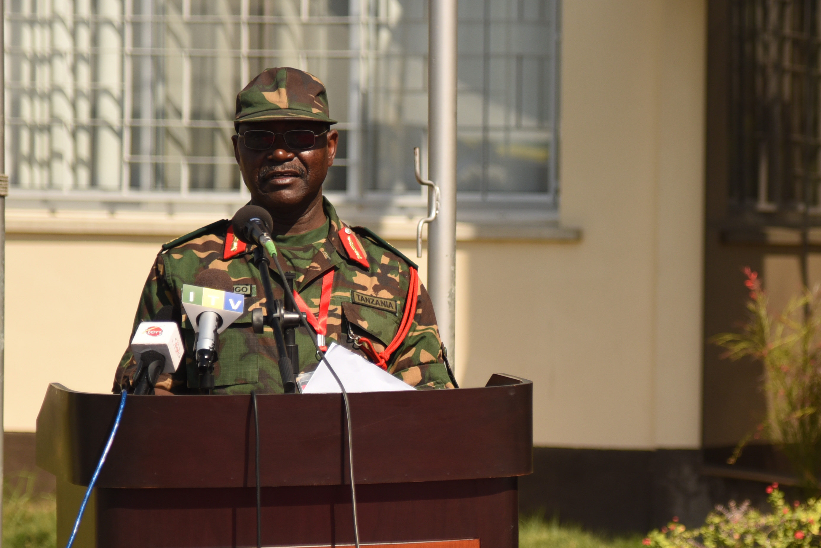 DAR ES SALAAM, Tanzania – Tanzanian Brig. Gen. Yohana Ocholla Mabongo, Eastern Accord 2016 exercise co-director, welcomes the participants to the Eastern Accord 2016 command post exercise during the Opening Ceremony at the Tanzanian Peacekeeping Training Centre on July, 11, 2016, in Dar es Salaam, Tanzania. EA16 is an annual, combined, joint military exercise that brings together partner nations to practice and demonstrate proficiency in conducting peacekeeping operations. (U.S. Air Force photo by Staff Sgt. Tiffany DeNault)