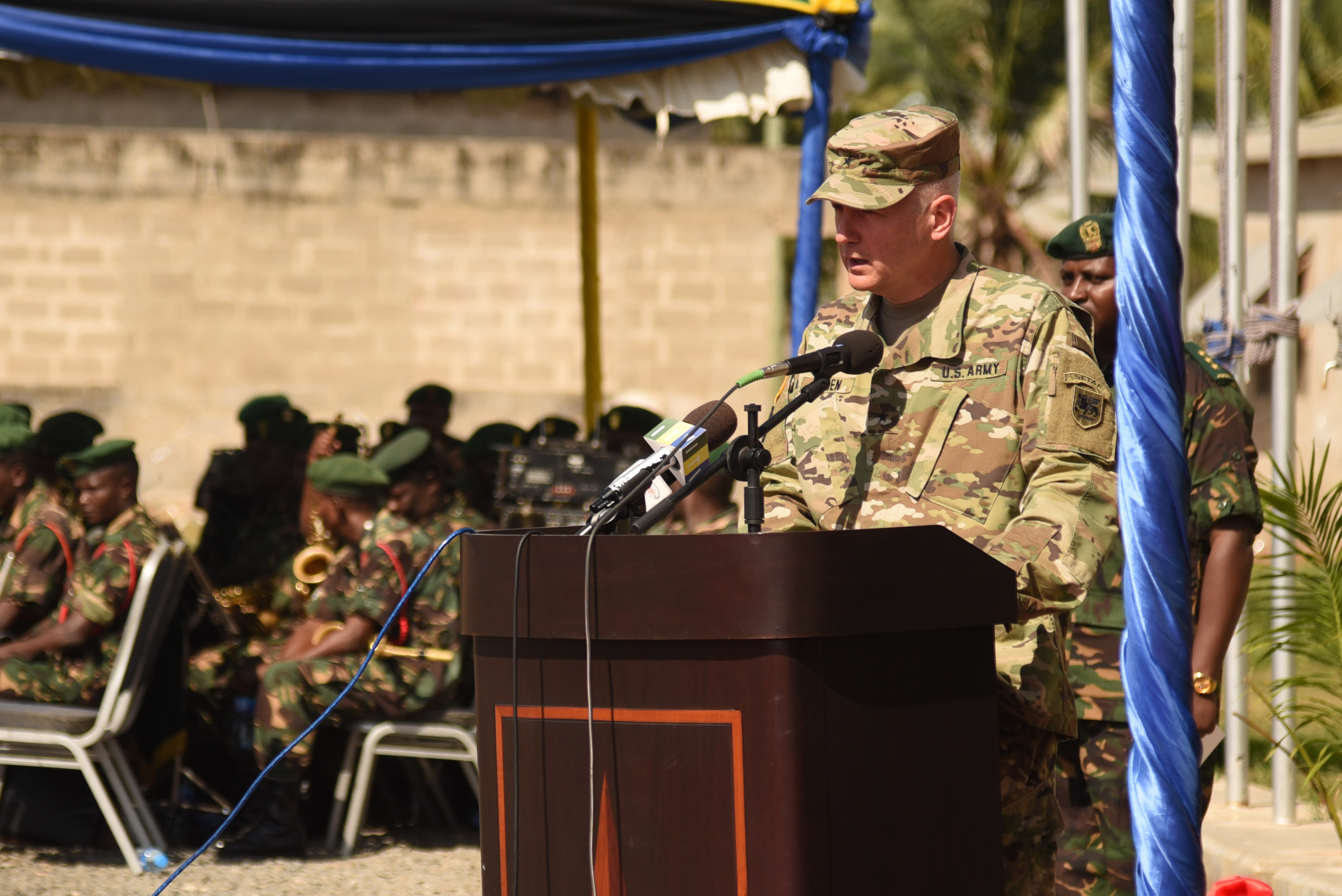 DAR ES SALAAM, Tanzania – U.S. Army Brig. Gen. Jon Jensen, U.S. Army Africa deputy commanding general and co-exercise director, welcomes participants to the Eastern Accord 2016 command post exercise during the opening ceremony at the Tanzanian Peacekeeping Training Centre on July, 11, 2016, Dar es Salaam, Tanzania. EA16 is an annual, combined, joint military exercise that brings together partner nations to practice and demonstrate proficiency in conducting peacekeeping operations. (U.S. Air Force photo by Staff Sgt. Tiffany DeNault)