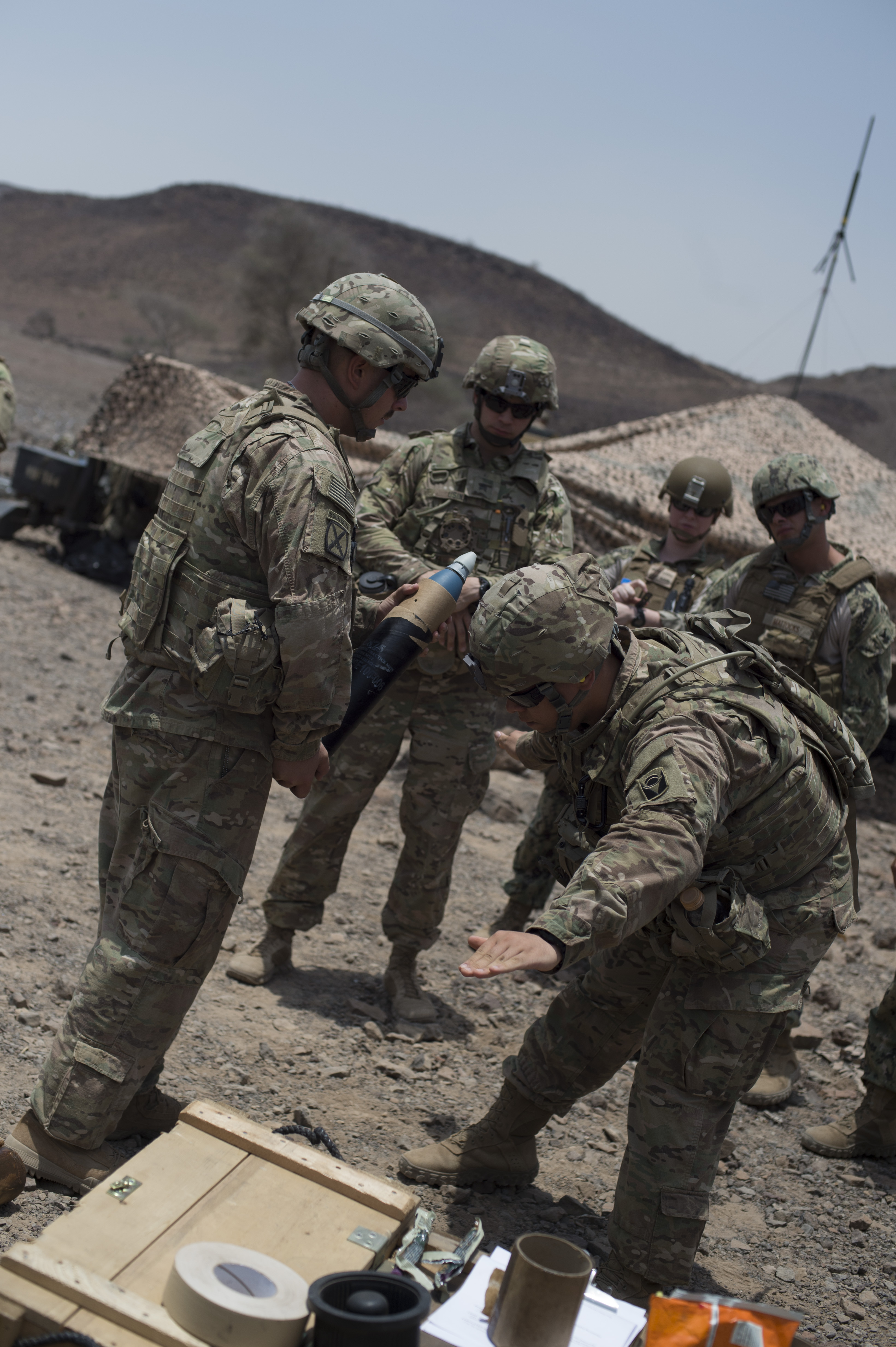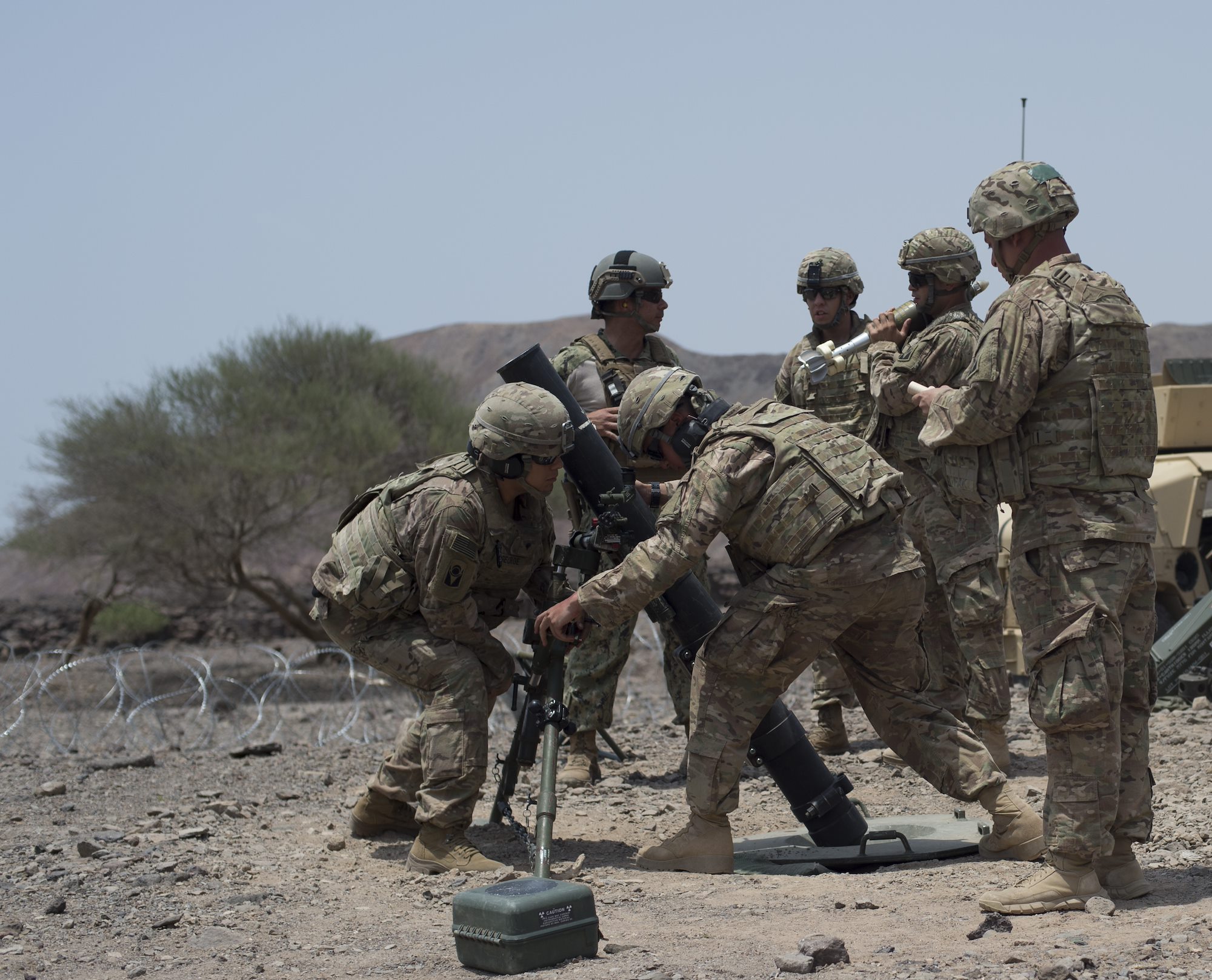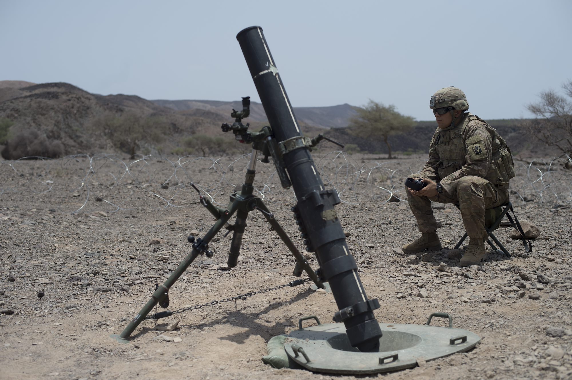 U.S. Army Soldiers from the 1st Battalion, 124th Infantry Regiment, Bravo Company, deployed from Cocoa, Fla., conducted mortar training Aug. 8, 2016, at Arta, Djibouti.