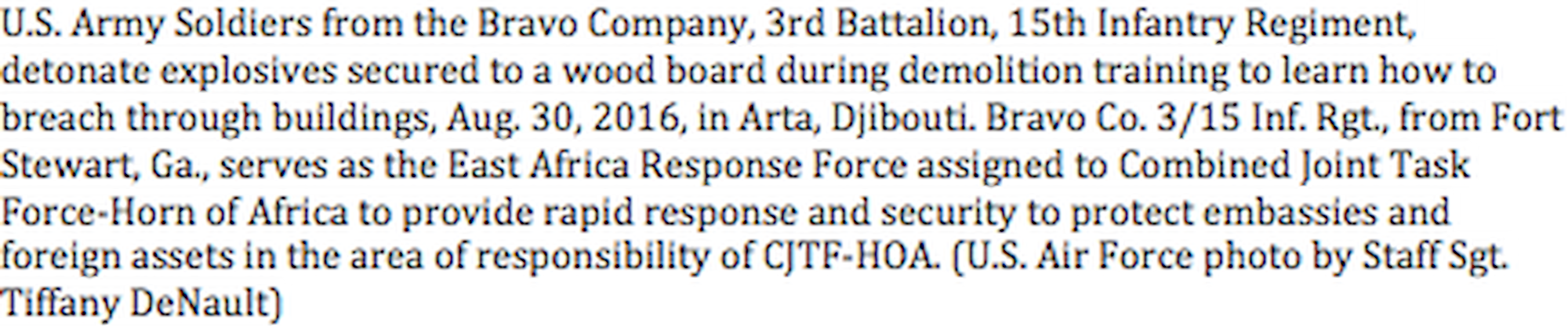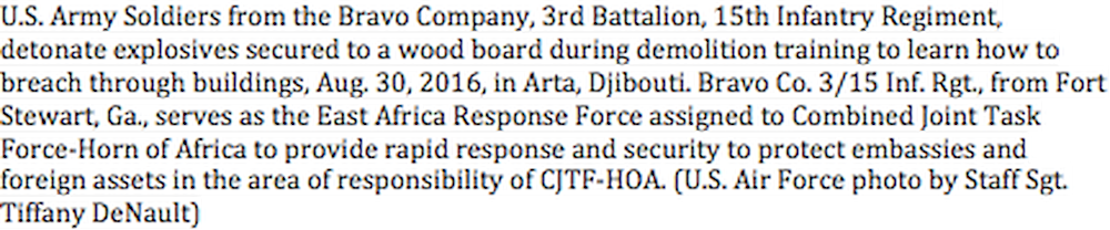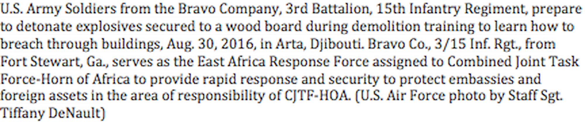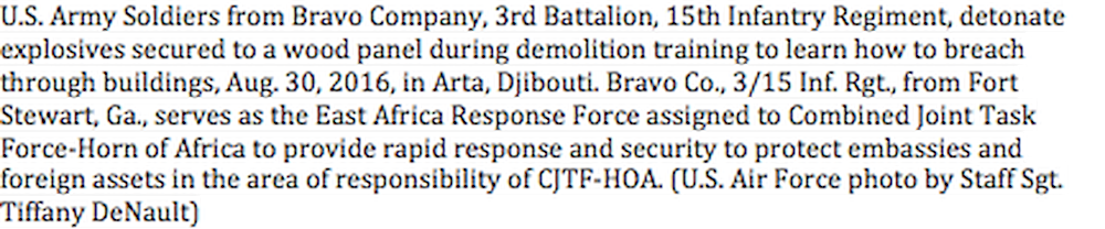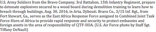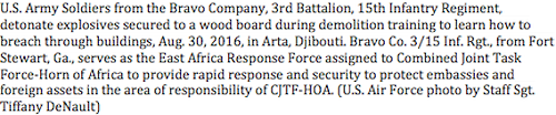 U.S. Army Soldiers from the Bravo Company, 3rd Battalion, 15th Infantry Regiment, detonate explosives secured to a wood board during demolition training to learn how to breach through buildings, Aug. 30, 2016, in Arta, Djibouti. Bravo Co. 3/15 Inf. Rgt., from Fort Stewart, Ga., serves as the East Africa Response Force assigned to Combined Joint Task Force-Horn of Africa to provide rapid response and security to protect embassies and foreign assets in the area of responsibility of CJTF-HOA. (U.S. Air Force photo by Staff Sgt. Tiffany DeNault)