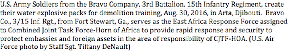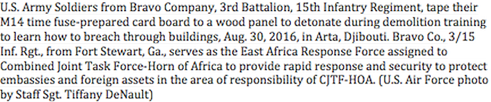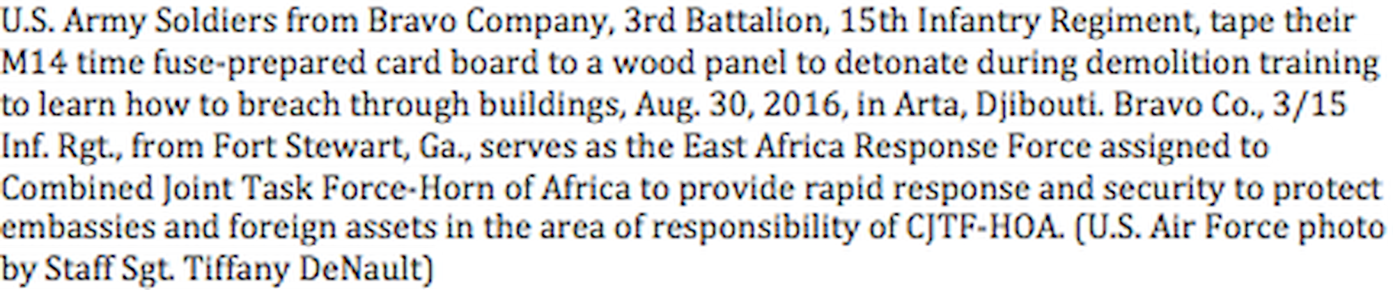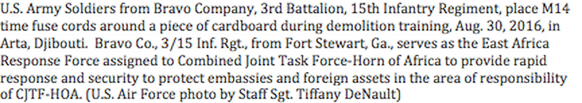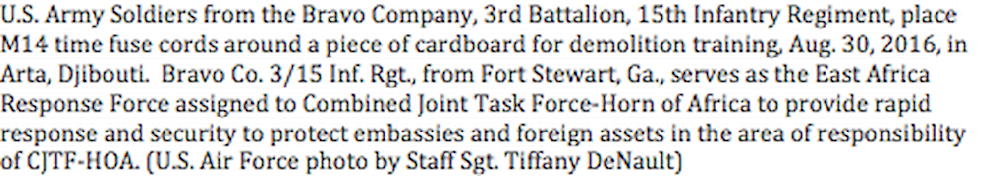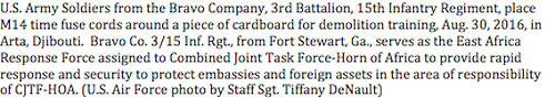 U.S. Army Soldiers from the Bravo Company, 3rd Battalion, 15th Infantry Regiment, place M14 time fuse cords around a piece of cardboard for demolition training, Aug. 30, 2016, in Arta, Djibouti. Bravo Co. 3/15 Inf. Rgt., from Fort Stewart, Ga., serves as the East Africa Response Force assigned to Combined Joint Task Force-Horn of Africa to provide rapid response and security to protect embassies and foreign assets in the area of responsibility of CJTF-HOA. (U.S. Air Force photo by Staff Sgt. Tiffany DeNault)