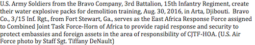U.S. Army Soldiers from the Bravo Company, 3rd Battalion, 15th Infantry Regiment, create their water explosive packs for demolition training, Aug. 30, 2016, in Arta, Djibouti. Bravo Co., 3/15 Inf. Rgt., from Fort Stewart, Ga., serves as the East Africa Response Force assigned to Combined Joint Task Force-Horn of Africa to provide rapid response and security to protect embassies and foreign assets in the area of responsibility of CJTF-HOA. (U.S. Air Force photo by Staff Sgt. Tiffany DeNault)