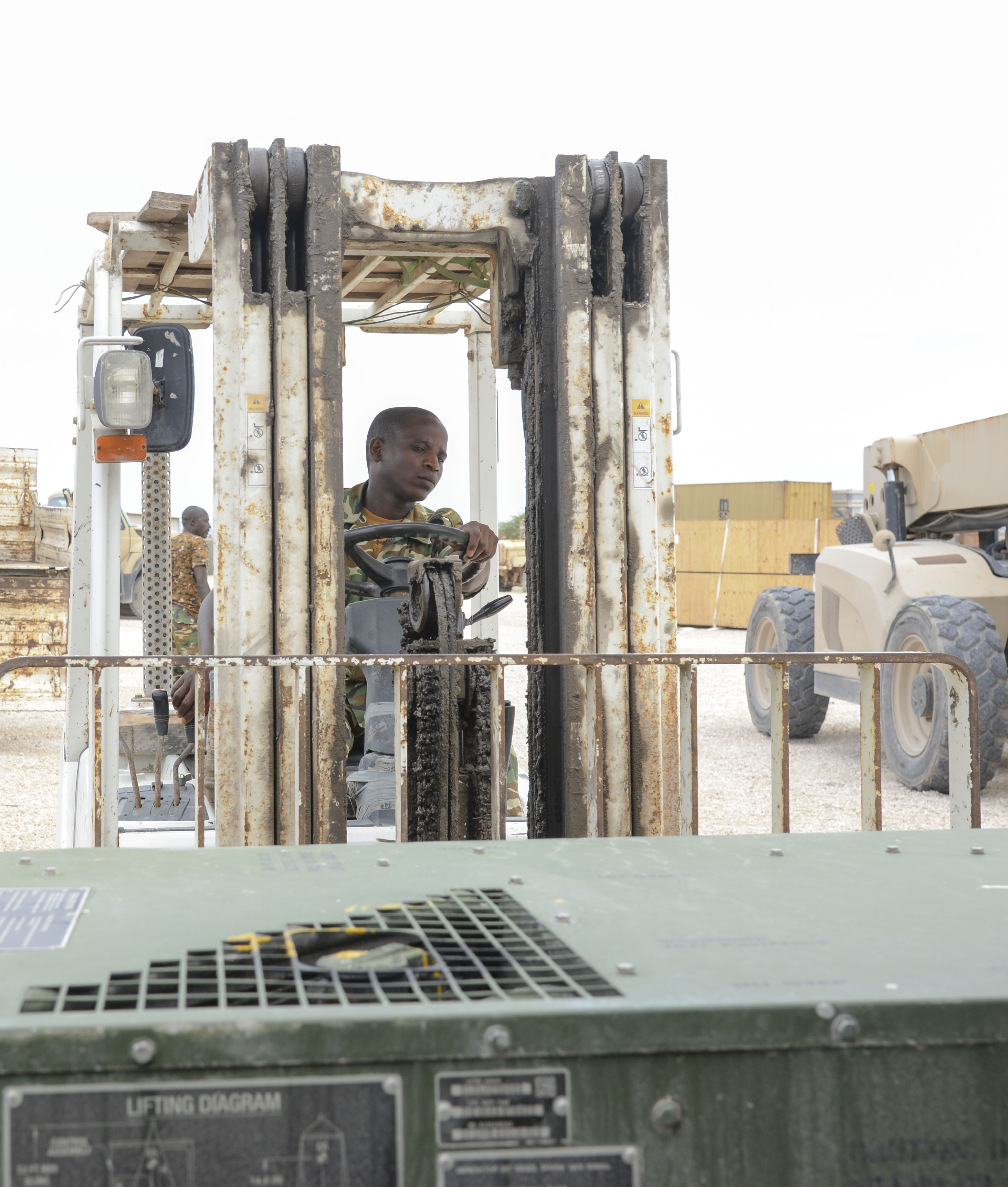 Burundi National Defense Force Cpl. Emmanuel, African Union Mission in Somalia Burundi contingent, uses a forklift to load a power generator onto a truck in Mogadishu, Somalia, Sept. 12, 2016. Burundi forces received more than 10 power generators, tires and spare parts for Mine Resistant Ambush Protected vehicles to remedy the wear and tear on vehicle parts caused by rough and uneven terrain. The MRAP vehicles are vital to keeping AMISOM forces safe from roadside bombs planted by al-Shabaab throughout Somalia. (U.S. Air Force photo by Staff Sgt. Benjamin Raughton)