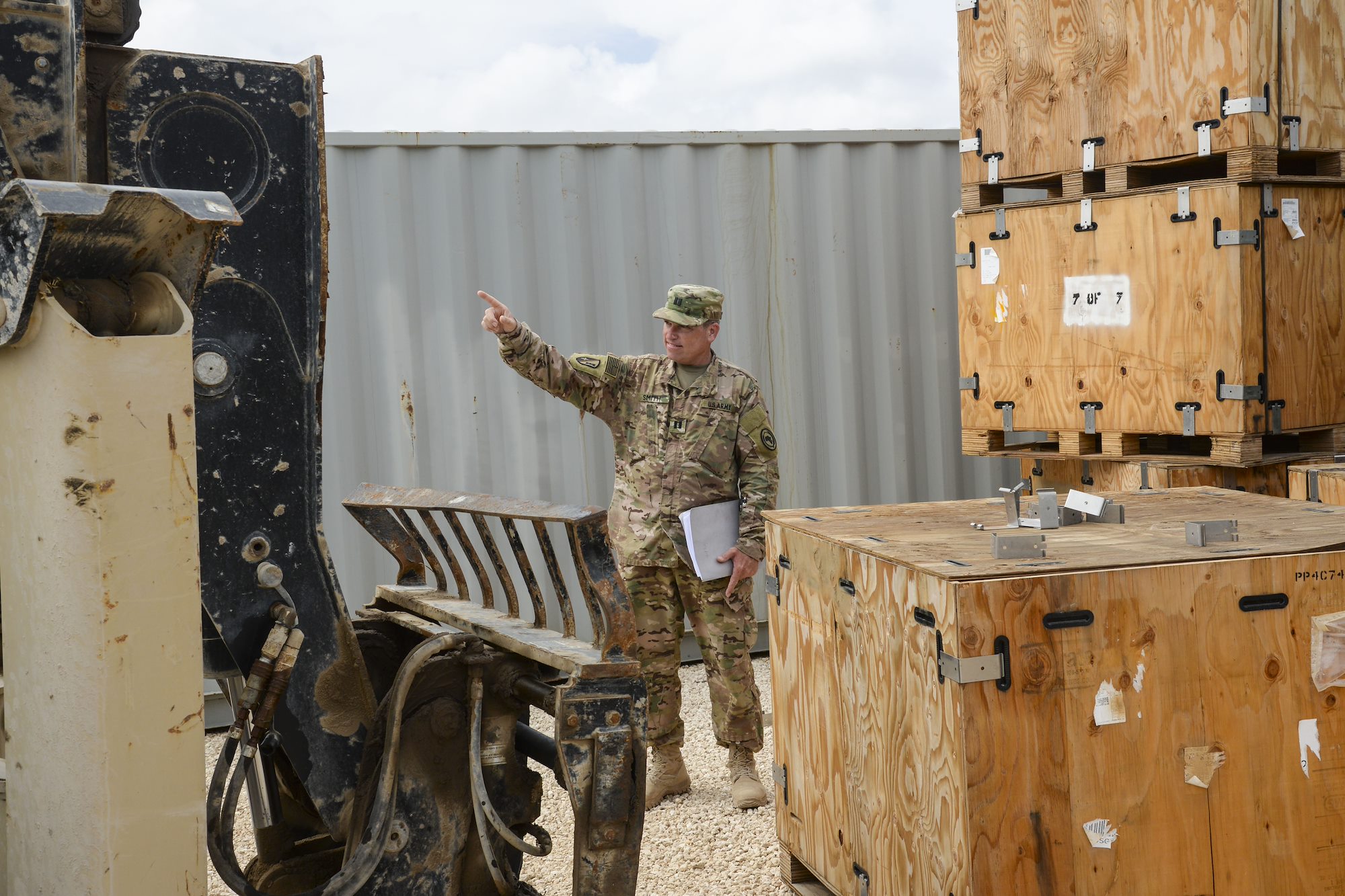 U.S. Army Capt. Mike Smith, Combined Joint Task Force- Horn of Africa Military Coordination Cell logistics representative, guides a forklift to pick up crates of tires in Mogadishu, Somalia, Sept. 12, 2016. Both African Union Mission in Somalia members and U.S. forces worked together to get all supplies stored in containers for use in dry locations, as weathering and rain can damage supplies exposed to the elements. (U.S. Air Force photo by Staff Sgt. Benjamin Raughton)