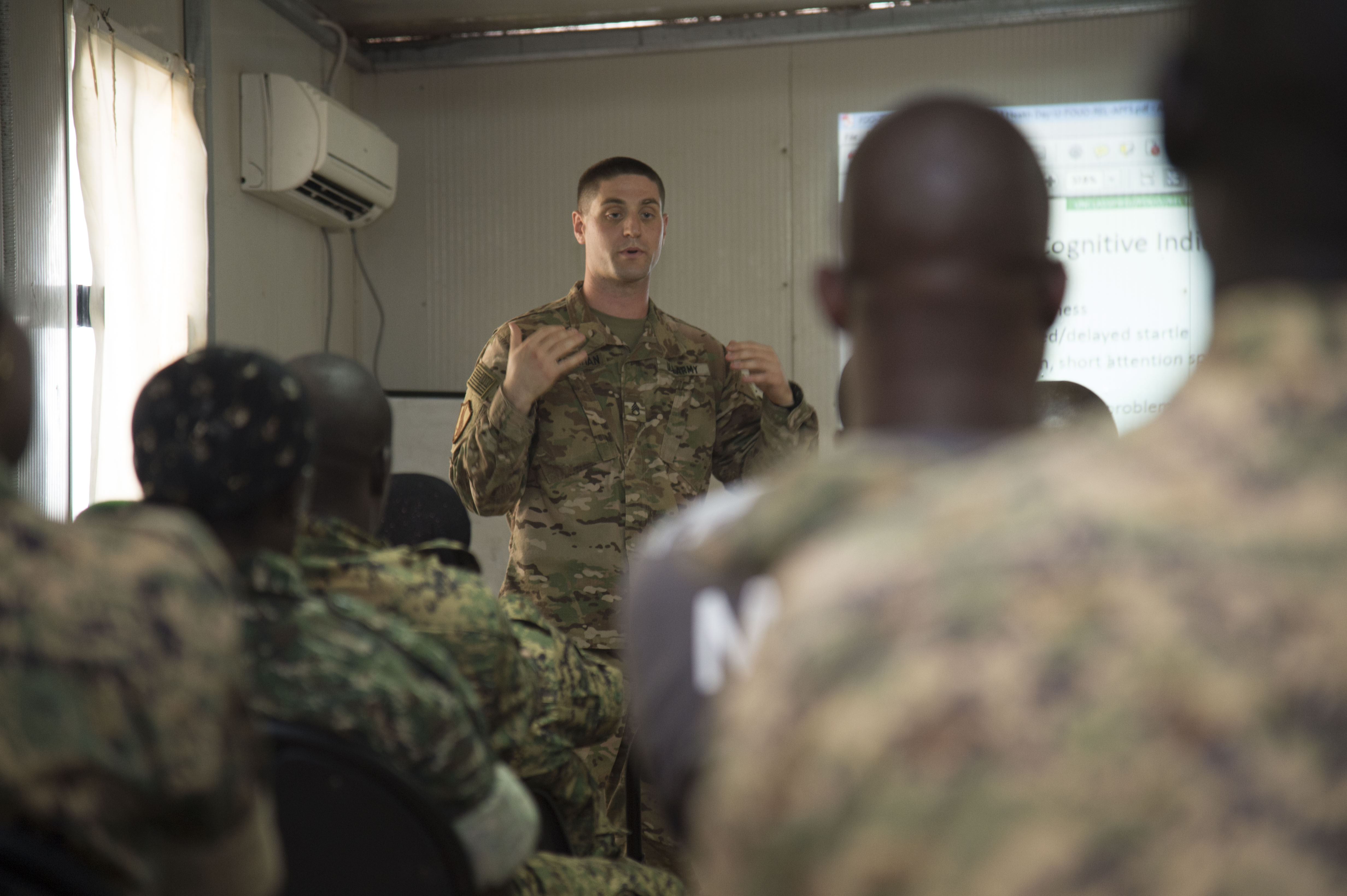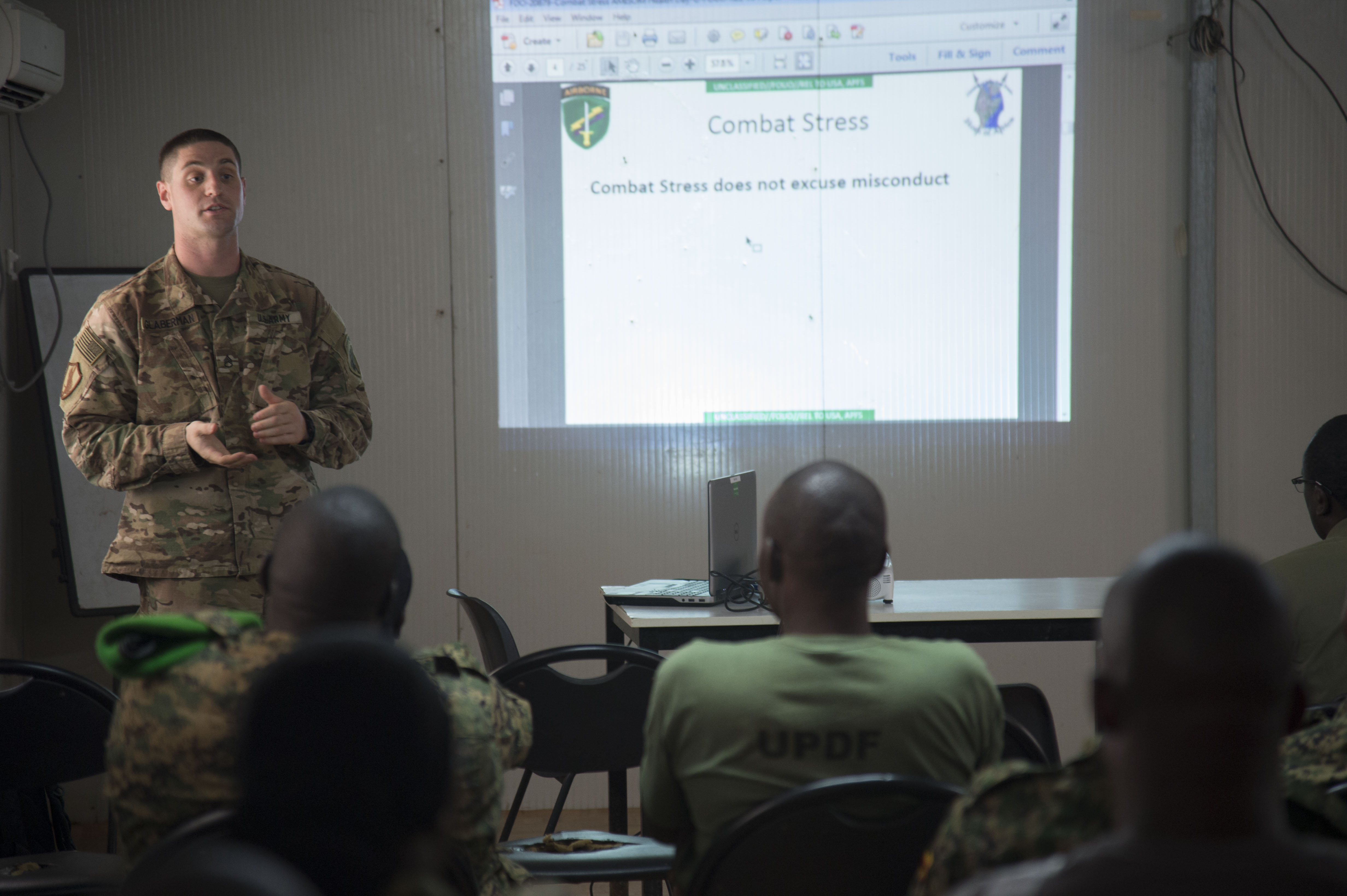 U.S. Army Staff Sgt. Matthew Glaberman, Charlie Company, 411th Civil Affairs Battalion operations sergeant, talks about the effects combat stress can have on a person in a deployed environment, and how to recognize and treat it during a mental health sharing of best practices Oct. 10, 2016, in Mogadishu, Somalia. More than 40 members of the Uganda People’s Defense Force attended the class to learn about combat stress while they are deployed in support of the African Union Mission to Somalia. (U.S. Air Force photo by Staff Sgt. Eric Summers Jr.)