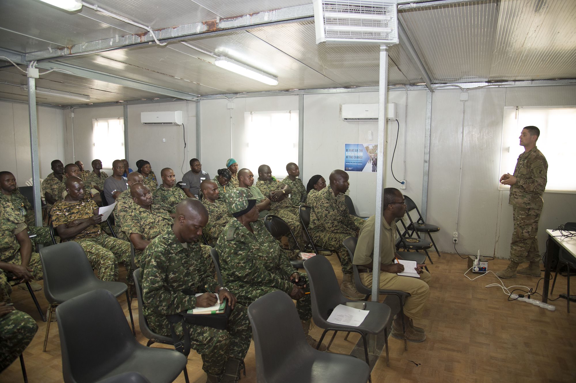 Members of the Uganda People’s Defense Force (UPDF) listen to U.S. Army Staff Sgt. Matthew Glaberman, Charlie Company, 411th Civil Affairs Battalion operations sergeant, as he speaks about ways to prepare for combat stress before a deployment Oct 10, 2016, at Mogadishu, Somalia. The UPDF is deployed in support of the African Union Mission to Somalia to combat extremist terrorists in the region and restore stability. (U.S. Air Force photo by Staff Sgt. Eric Summers Jr.)