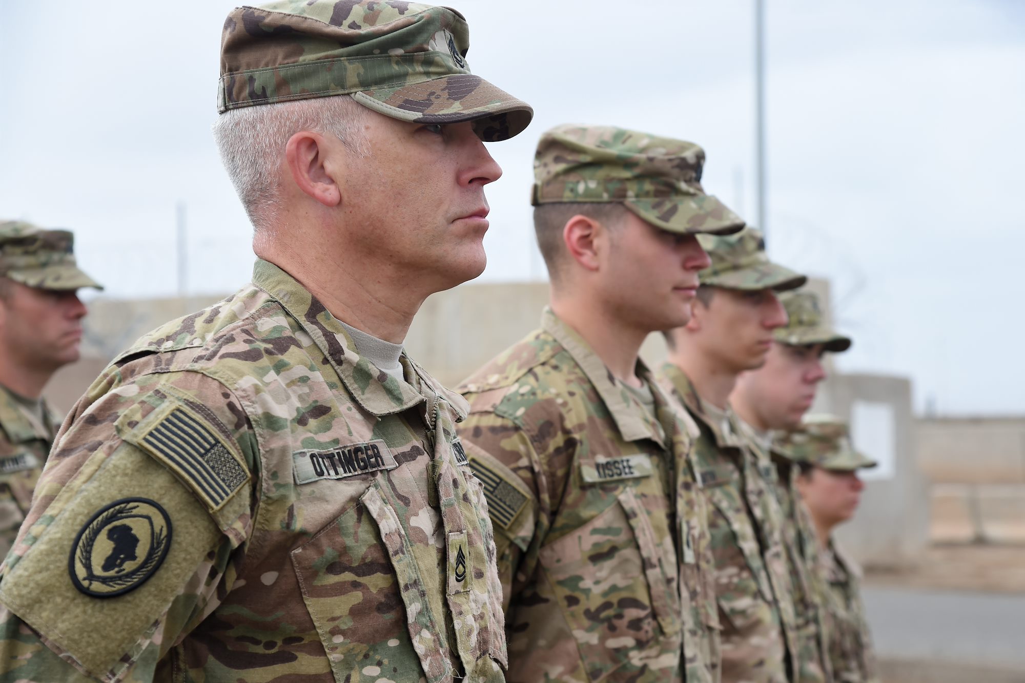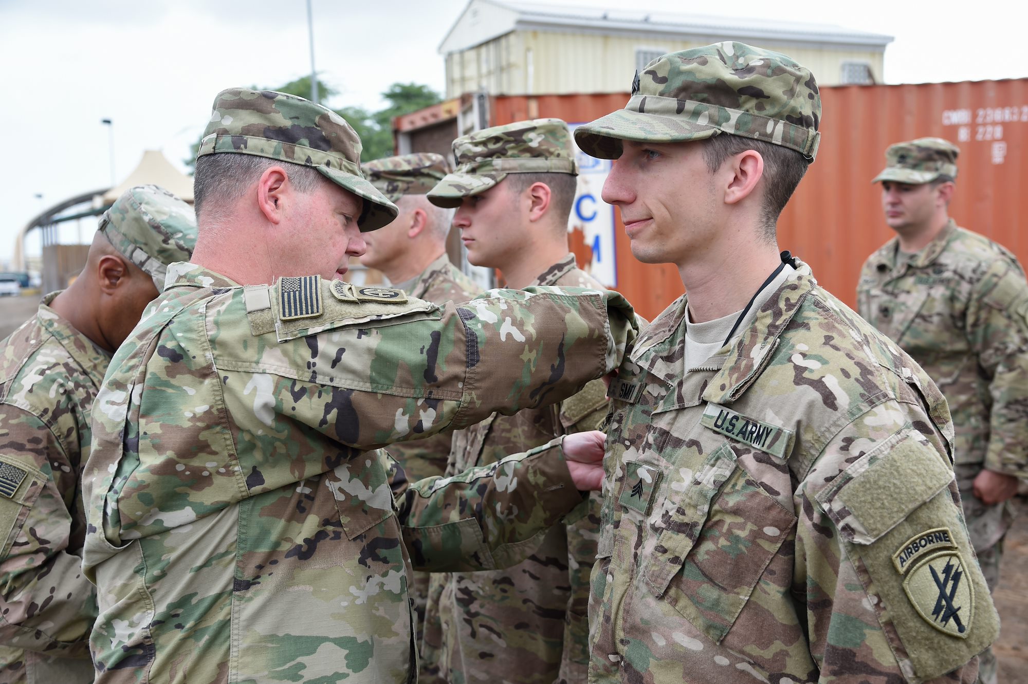 U.S. Soldiers assigned to Combined Joint Task Force-Horn of Africa's operations directorate are presented with the U.S. Africa Command combat patch during a ceremony at Camp Lemonnier, Djibouti.