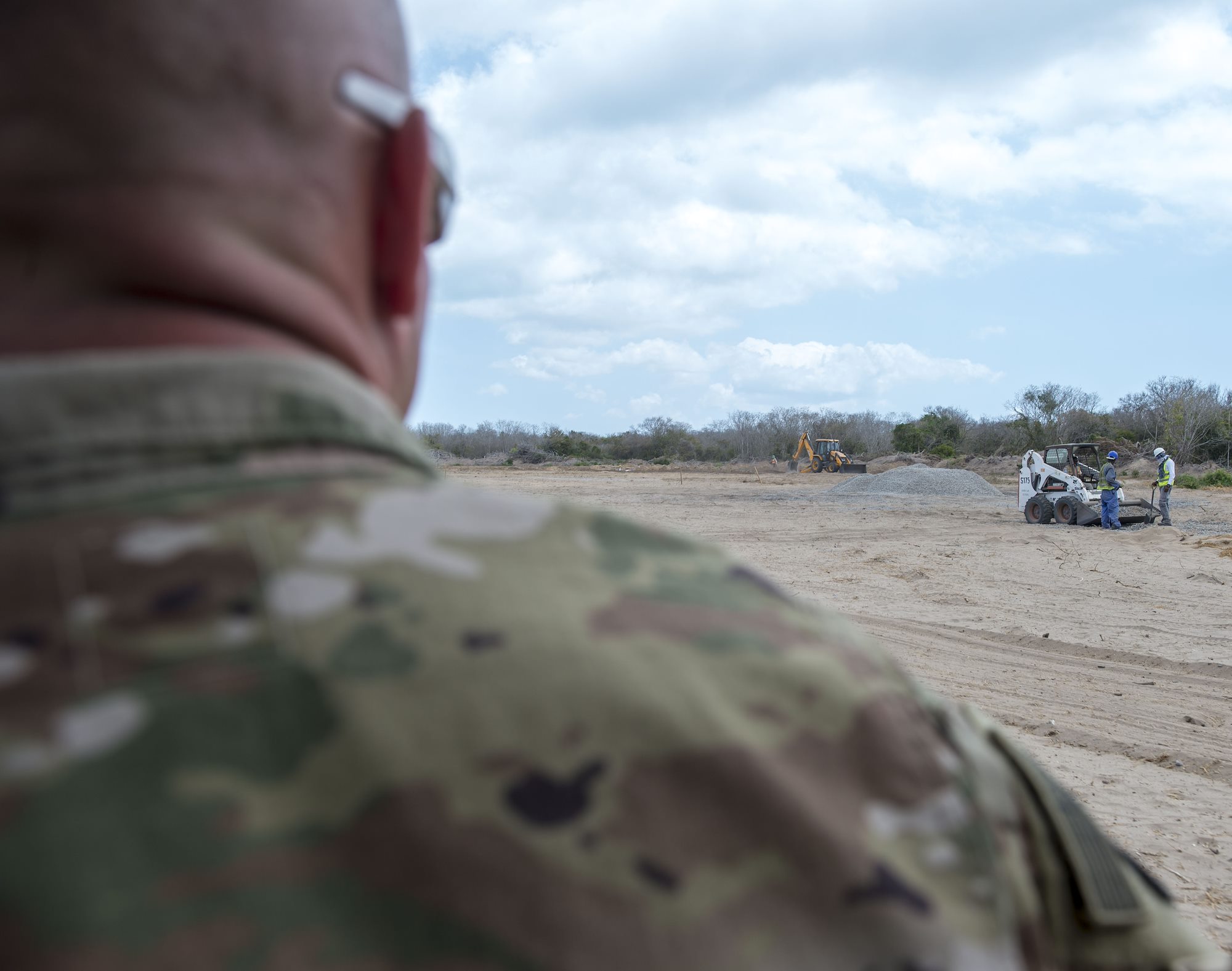 U.S. Army Lt. Col. Todd Martin, safety officer assigned to the Combined Joint Task Force - Horn of Africa (CJTF-HOA) Safety directorate, watches local national workers during a battlefield circulation site visit at Camp Simba in Manda Bay, Kenya, Feb. 24, 2018. The CJTF-HOA Safety and Inspector General directorates provide support to the service members, Department of Defense civilians, and local national and third-country national contractors who work on the camp. Though many of the members at the camp don't fall under CJTF-HOA, many of the concerns that affect the CJTF-HOA personnel also affect them and vice versa. (U.S. Air Force photo by Staff Sgt. Timothy Moore)