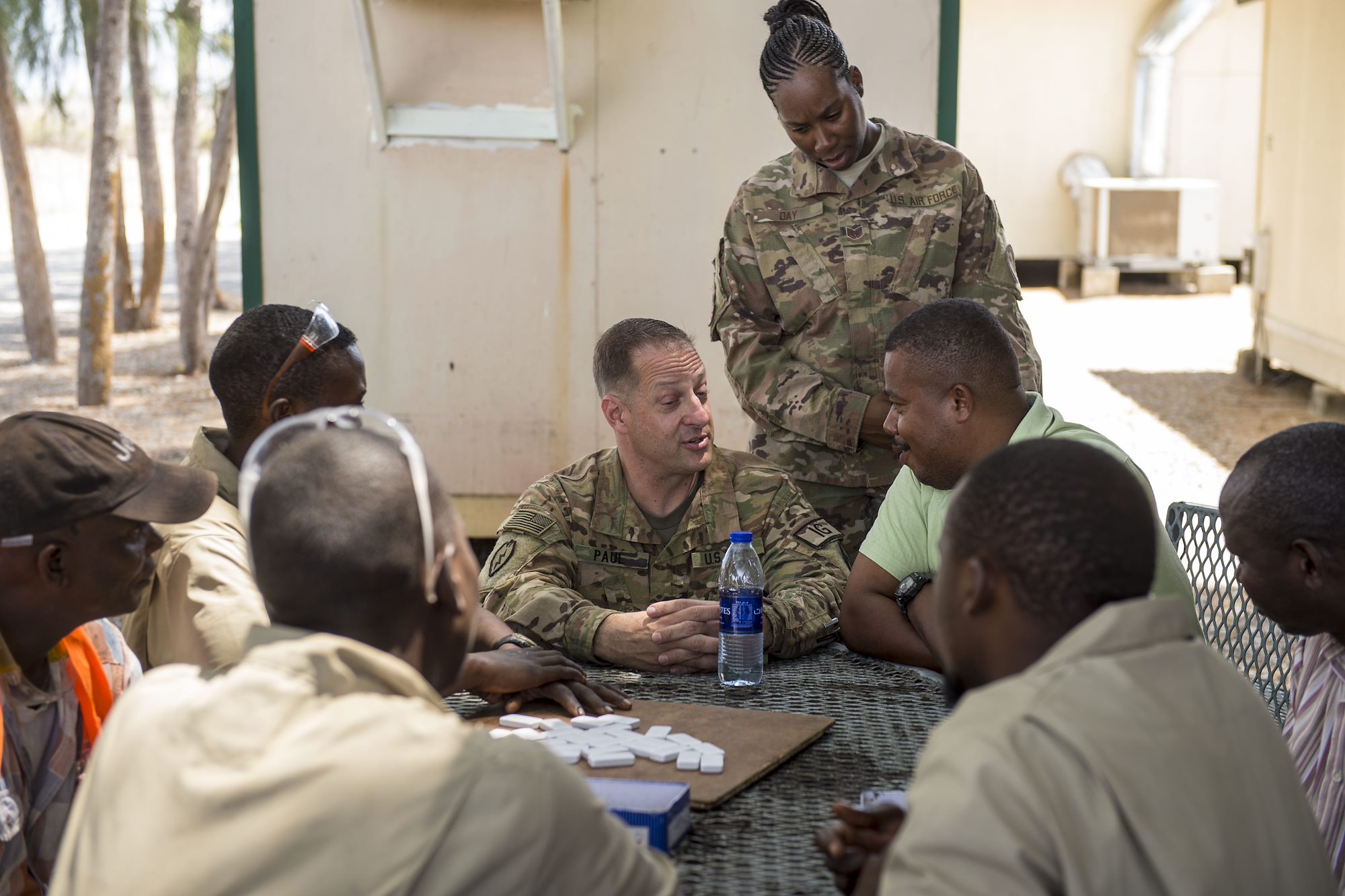 U.S. Army Maj. Robert T. Paul, command inspector general, and U.S. Air Force Tech. Sgt. Starr Day, assistant inspector general, talk with local national contractors during a battlefield circulation site visit at Camp Simba in Manda Bay, Kenya, Feb. 24, 2018. While assigned to the Combined Joint Task Force - Horn of Africa Inspector General directorate, Paul and Day provide support to the service members, Department of Defense civilians, and local national and third-country national contractors who work on the camp. Though many of the members at the camp don't fall under CJTF-HOA's command, many of the concerns that affect the CJTF-HOA personnel also affect them and vice versa. (U.S. Air Force photo by Staff Sgt. Timothy Moore)