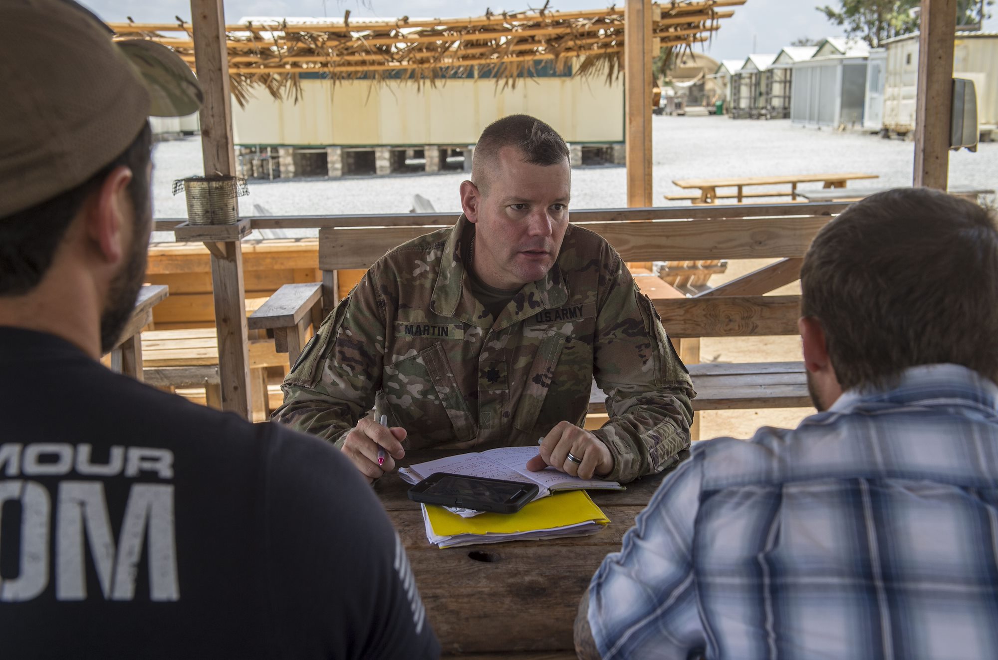 U.S. Army Lt. Col. Todd Martin, left, safety officer assigned to the Combined Joint Task Force - Horn of Africa (CJTF-HOA) Safety directorate, speaks with CJTF-HOA personnel assigned to Camp Simba in Manda Bay, Kenya, about safety concerns during a battlefield circulation site visit Feb. 24, 2018. The CJTF-HOA Safety and Inspector General directorates provide support to the service members, Department of Defense civilians, and local national and third-country national contractors who work on the camp. Though many of the members at the camp don't fall under CJTF-HOA, many of the concerns that affect the CJTF-HOA personnel also affect them and vice versa. (U.S. Air Force photo by Staff Sgt. Timothy Moore)