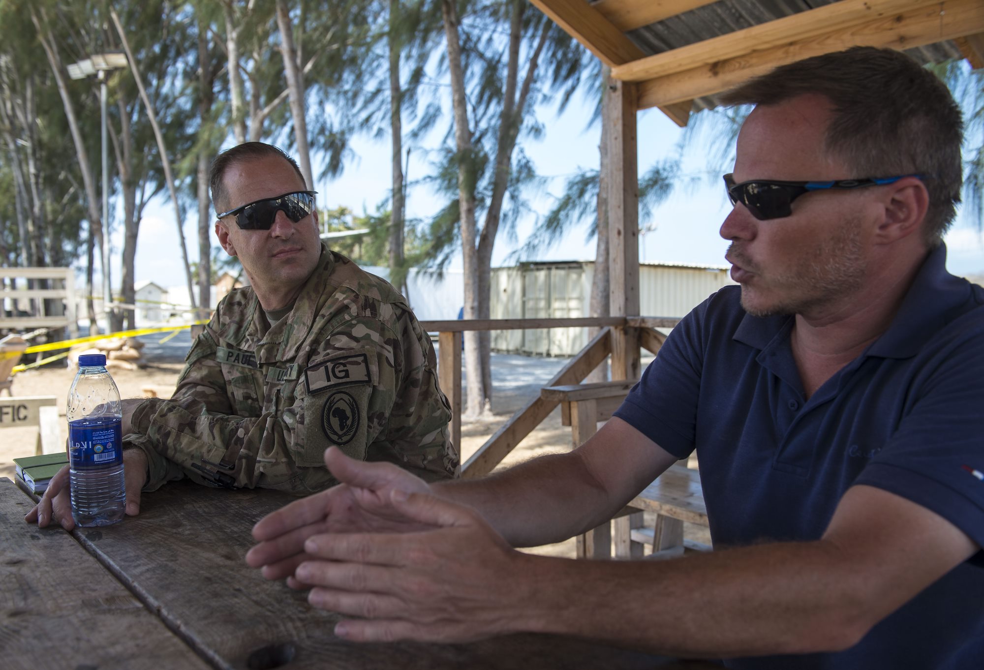 U.S. Army Maj. Robert T. Paul, left, command inspector general assigned to the Combined Joint Task Force - Horn of Africa (CJTF-HOA) Inspector General (IG) directorate, talks with a Department of Defense (DOD) contractor during a battlefield circulation site visit at Camp Simba in Manda Bay, Kenya, Feb. 24, 2018. The CJTF-HOA IG and Safety directorates provide support to the service members, DOD civilians, and local national and third-country national contractors who work on the camp. Though many of the members at the camp don't fall under CJTF-HOA's command, many of the concerns that affect the CJTF-HOA personnel also affect them and vice versa. (U.S. Air Force photo by Staff Sgt. Timothy Moore)