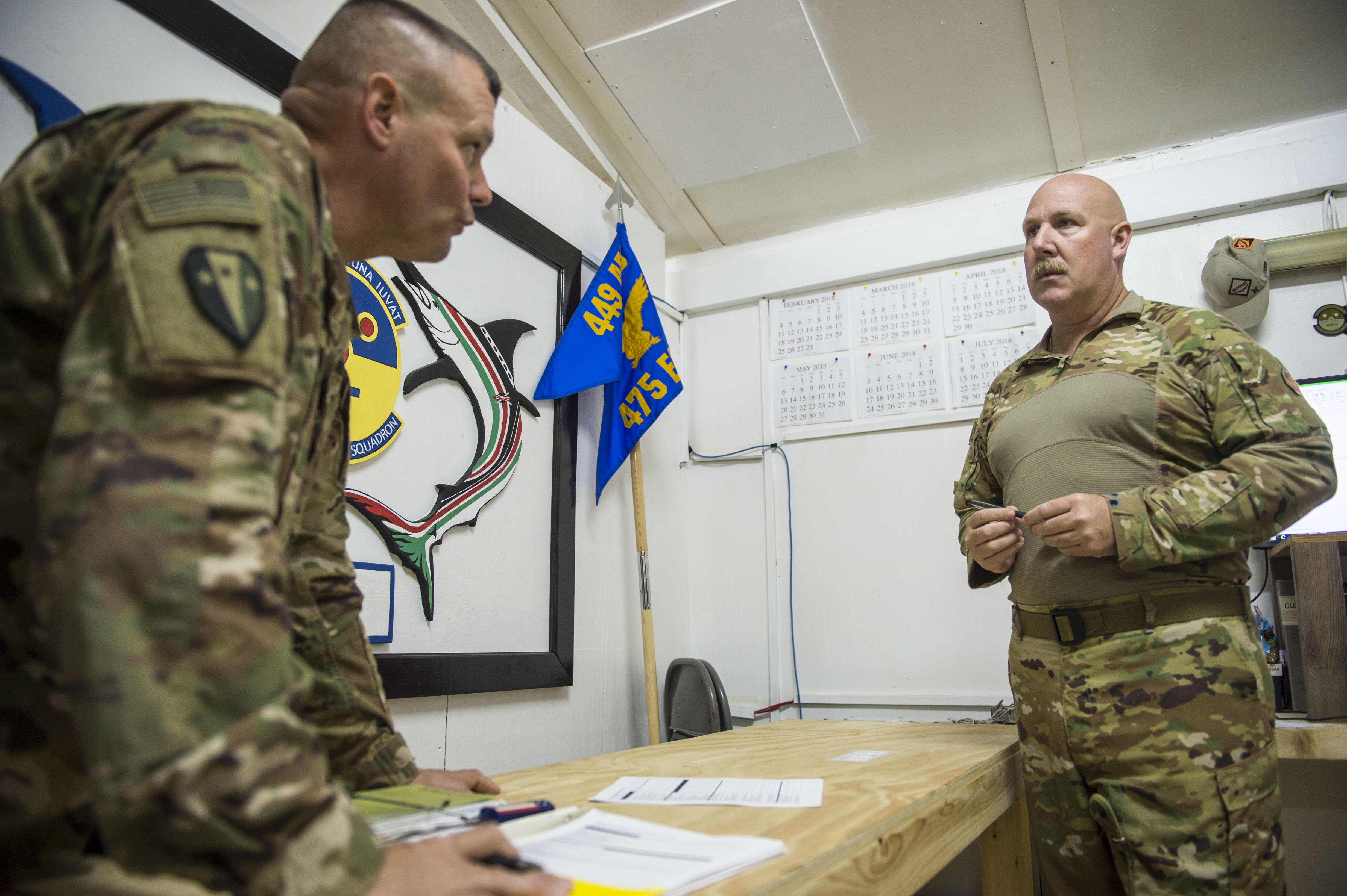 U.S. Army Lt. Col. Todd Martin, left, safety officer assigned to the Combined Joint Task Force - Horn of Africa (CJTF-HOA) Safety directorate, speaks with U.S. Air Force Lt. Col. Vance Goodfellow, 475th Expeditionary Air Base Squadron (EABS) commander, about a safety inspection he performed during a battlefield circulation site visit at Camp Simba in Manda Bay, Kenya, Feb. 24, 2018. Camp Simba is currently operated by the 475th EABS, who fall under the 435th Air Expeditionary Wing, but the property hosts CJTF-HOA personnel and is in the CJTF-HOA area of operations. As such, the CJTF-HOA Safety and Inspector General directorates provide support to the service members, Department of Defense civilians, and local national contractors who work on the camp. (U.S. Air Force photo by Staff Sgt. Timothy Moore)