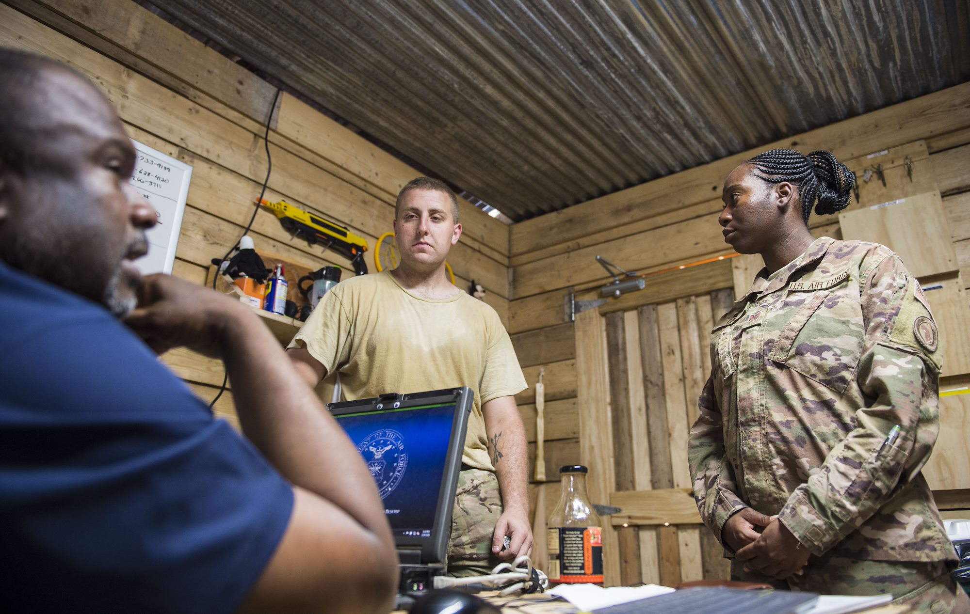 U.S. Air Force Tech. Sgt. Starr Day, right, assistant inspector general assigned to the Combined Joint Task Force - Horn of Africa (CJTF-HOA) Inspector General (IG) directorate, talks with a service member and a Department of Defense (DOD) contractor during a battlefield circulation site visit at Camp Simba in Manda Bay, Kenya, Feb. 24, 2018. The CJTF-HOA IG and Safety directorates provide support to the service members, DOD civilians, and local national and third-country national contractors who work on the camp. Though many of the members at the camp don't fall under CJTF-HOA's command, many of the concerns that affect the CJTF-HOA personnel also affect them and vice versa. (U.S. Air Force photo by Staff Sgt. Timothy Moore)