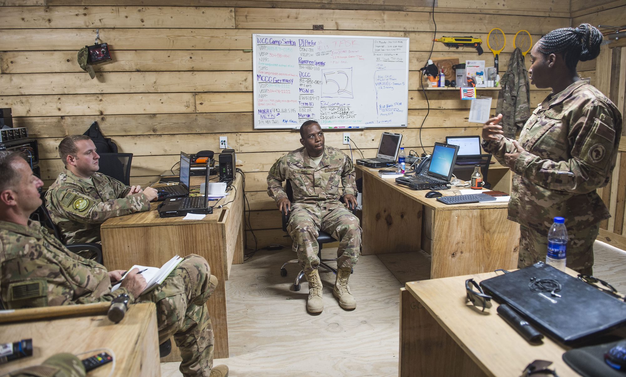 U.S. Air Force Tech. Sgt. Starr Day, assistant inspector general assigned to the Combined Joint Task Force - Horn of Africa (CJTF-HOA) Inspector General (IG) directorate, talks with service members during a battlefield circulation site visit at Camp Simba in Manda Bay, Kenya, Feb. 24, 2018. The CJTF-HOA IG and Safety directorates provide support to the service members, Department of Defense civilians, and local national and third-country national contractors who work on the camp. Though many of the members at the camp don't fall under CJTF-HOA's command, many of the concerns that affect the CJTF-HOA personnel also affect them and vice versa. (U.S. Air Force photo by Staff Sgt. Timothy Moore)