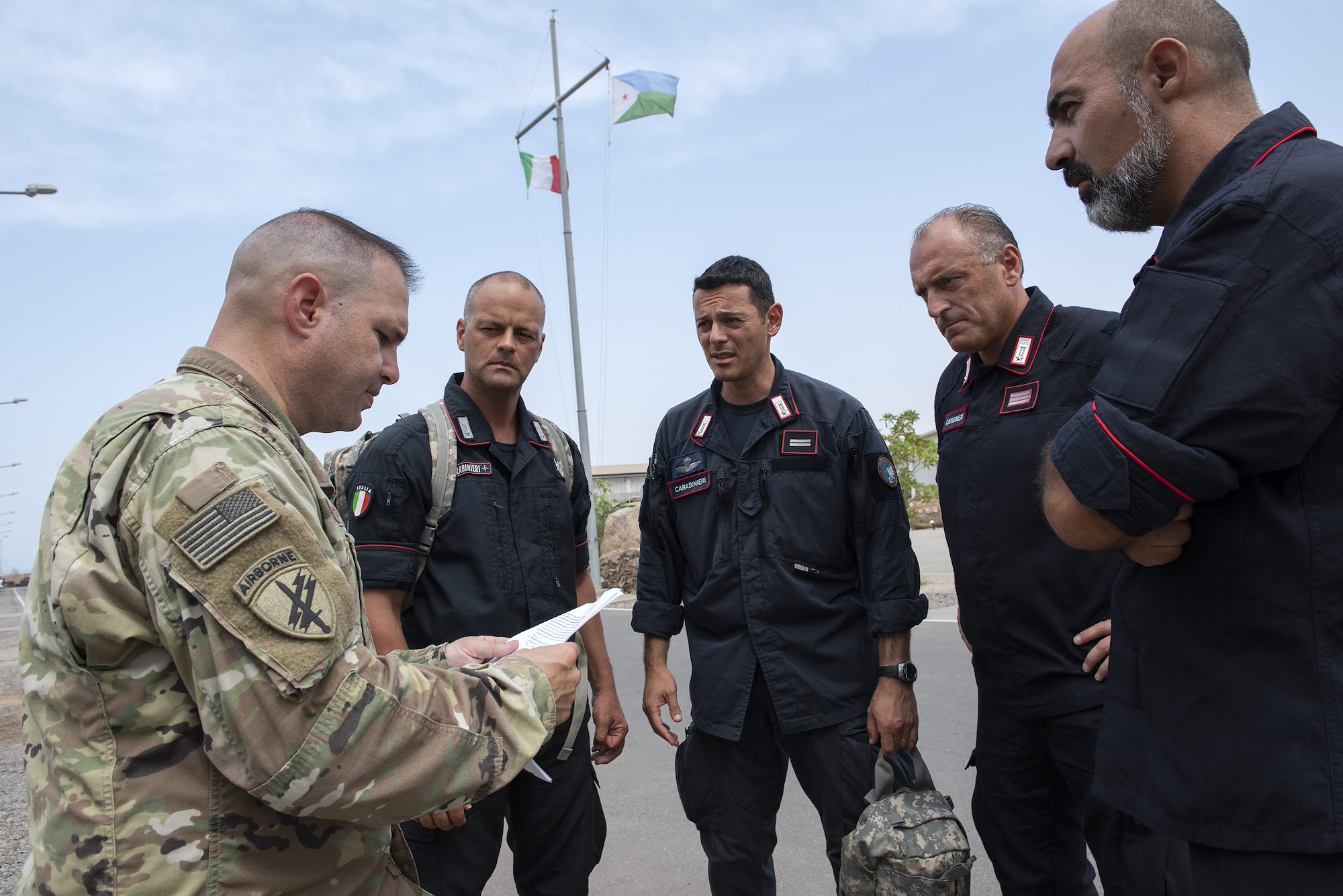 U.S. Army Staff Sgt. Richard Rye, a medic with the 404th Civil Affairs Battalion Functional Specialty Team, gives instructions to Italian soldiers with the 1st Paratroopers Carabinieri Regiment, Tuscania, during a Combat Lifesaver Course on Base Militar Italiano de Supporte, Djibouti, April 28, 2018. The medics were overseeing the combat lifesaver lanes, which are the final task for the students prior to completion of the course. (U.S. Air National Guard photo by Master Sgt. Sarah Mattison)