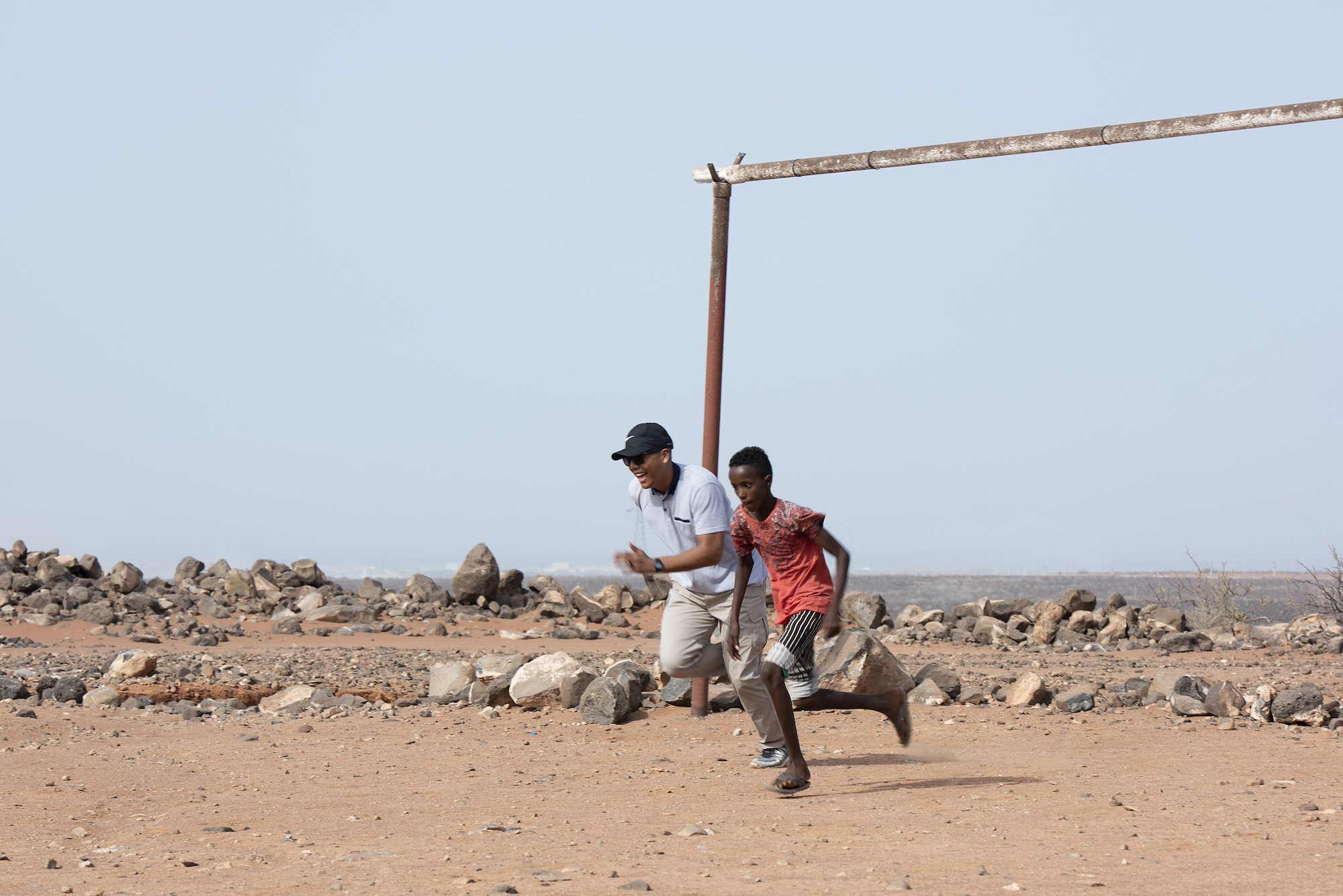 U.S. Air Force 1st Lt. Darren Domingo, officer in charge, Combat Camera, assigned to Combined Joint Task Force - Horn of Africa, races with a child from the local village outside of Chebelley Village, Djibouti, Aug. 3, 2018. Domingo was one of 30 service members participating in an outreach event organized by the 404th Civil Affairs Battalion. (U.S. Air National Guard photo by Master Sgt. Sarah Mattison)