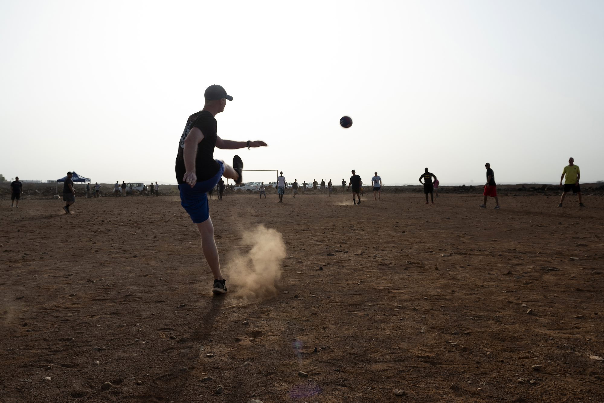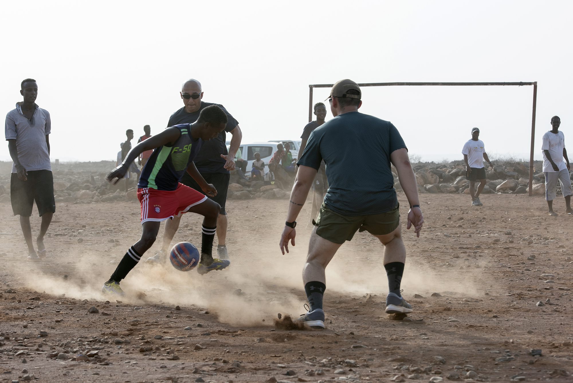 “We are out here to play soccer with the kids in Chebelley Village,” said Capt. Deandre Garlington, a civil affairs officer with the 404th. “They don’t have a lot here, but the one thing they do have is space to play soccer and a passion for the game.”