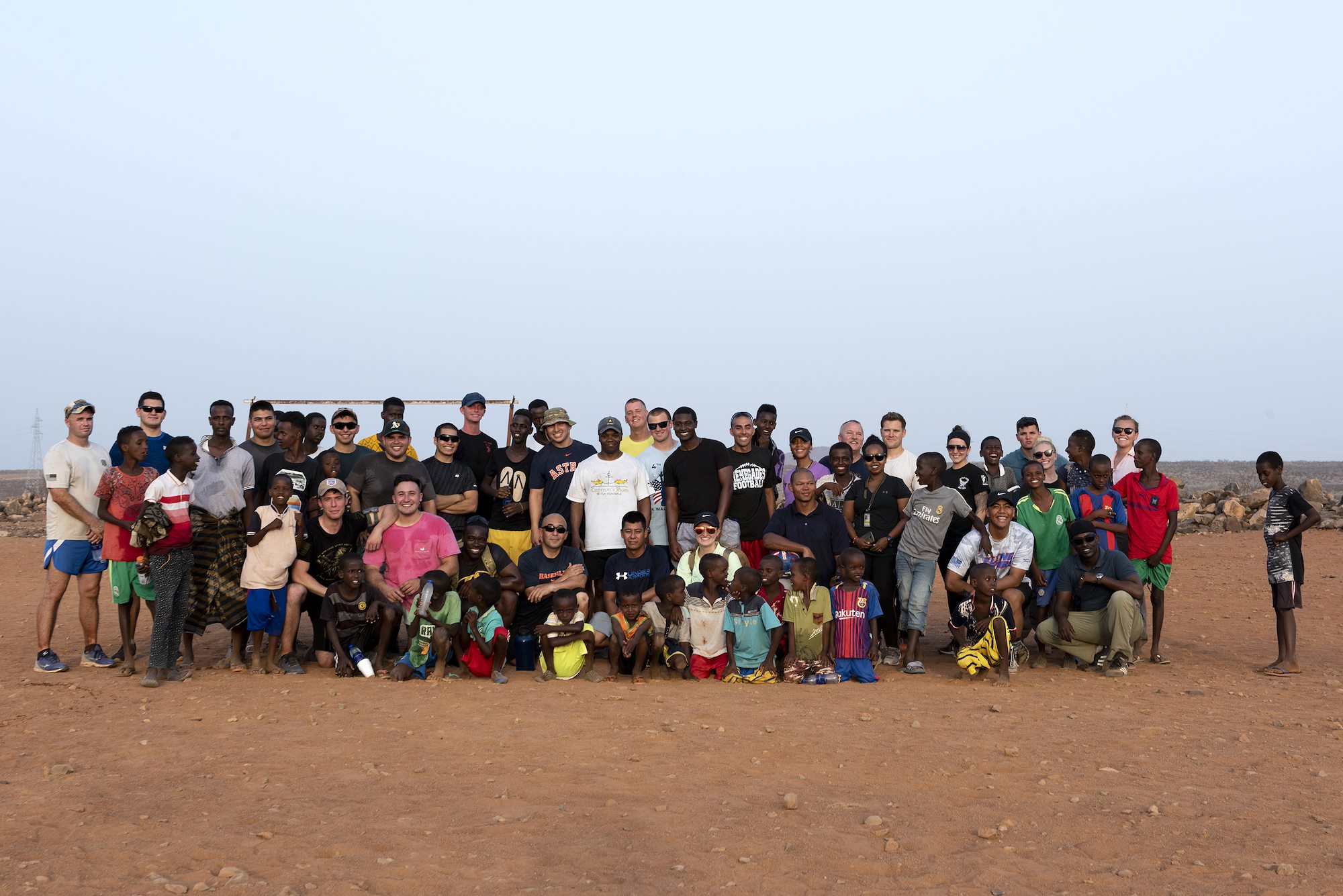 U.S. Service members assigned to Combined Joint Task Force - Horn of Africa participate in a friendly game of soccer with children from the nearby village, outside of Chebelley village, Djibouti, Aug. 3, 2018. Over 30 Soldiers and Airmen volunteered for the outreach event organized by the 404th Civil Affairs Battalion. (U.S. Air National Guard photo by Master Sgt. Sarah Mattison)