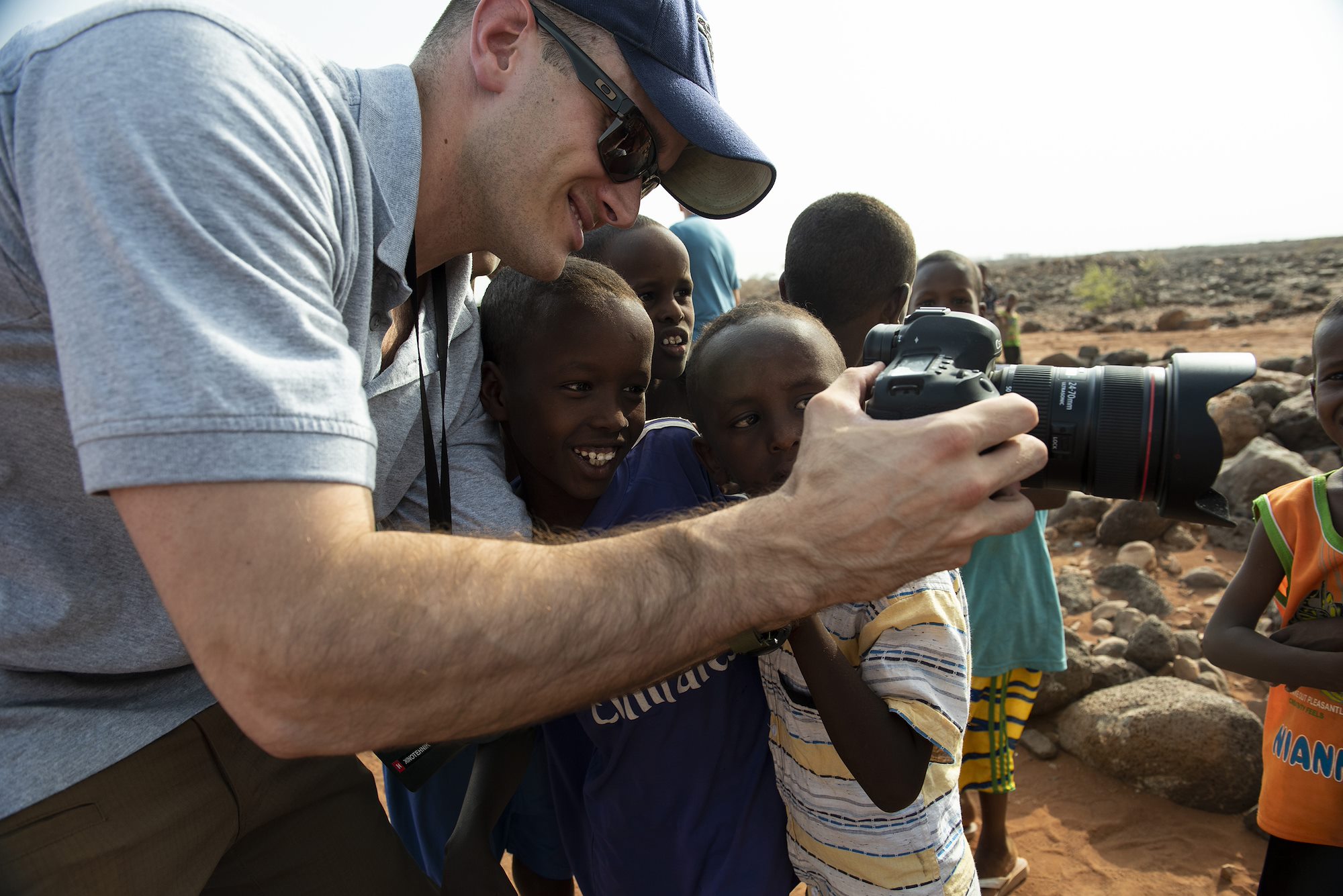 U.S. Air Force Master Sgt. Andrew Sinclair, broadcaster, Combined Joint Task Force - Horn of Africa, public affairs, demonstrates how to use his camera to Djiboutian children, outside of Chebelley Village, Djibouti, Aug. 3, 2018. Sinclair was there to document a soccer game in which U.S. Service members teamed up with children from the nearby village as part of a community engagement event organized by the 404th Civil Affairs Battalion. (U.S. Air National Guard photo by Master Sgt. Sarah Mattison)