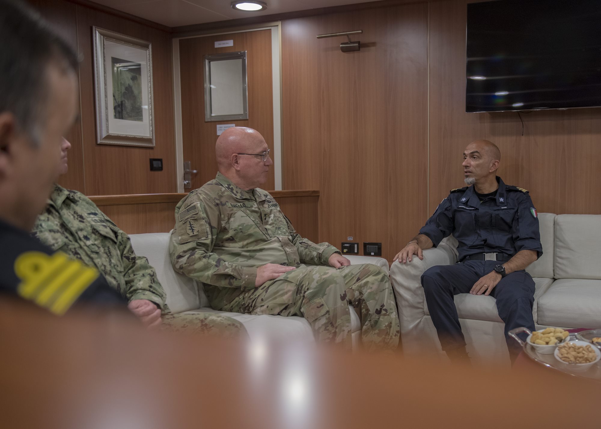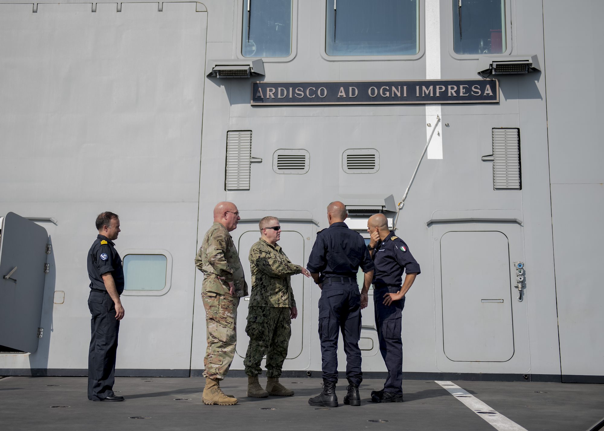 DJIBOUTI CITY, Djibouti – U.S. Army Maj. Gen. Michael D. Turello, commanding general of Combined Joint Task Force-Horn of Africa, visited with leaders of Operation Atalanta on board ITS Antonio Marceglia, outside Djibouti City, Djibouti.