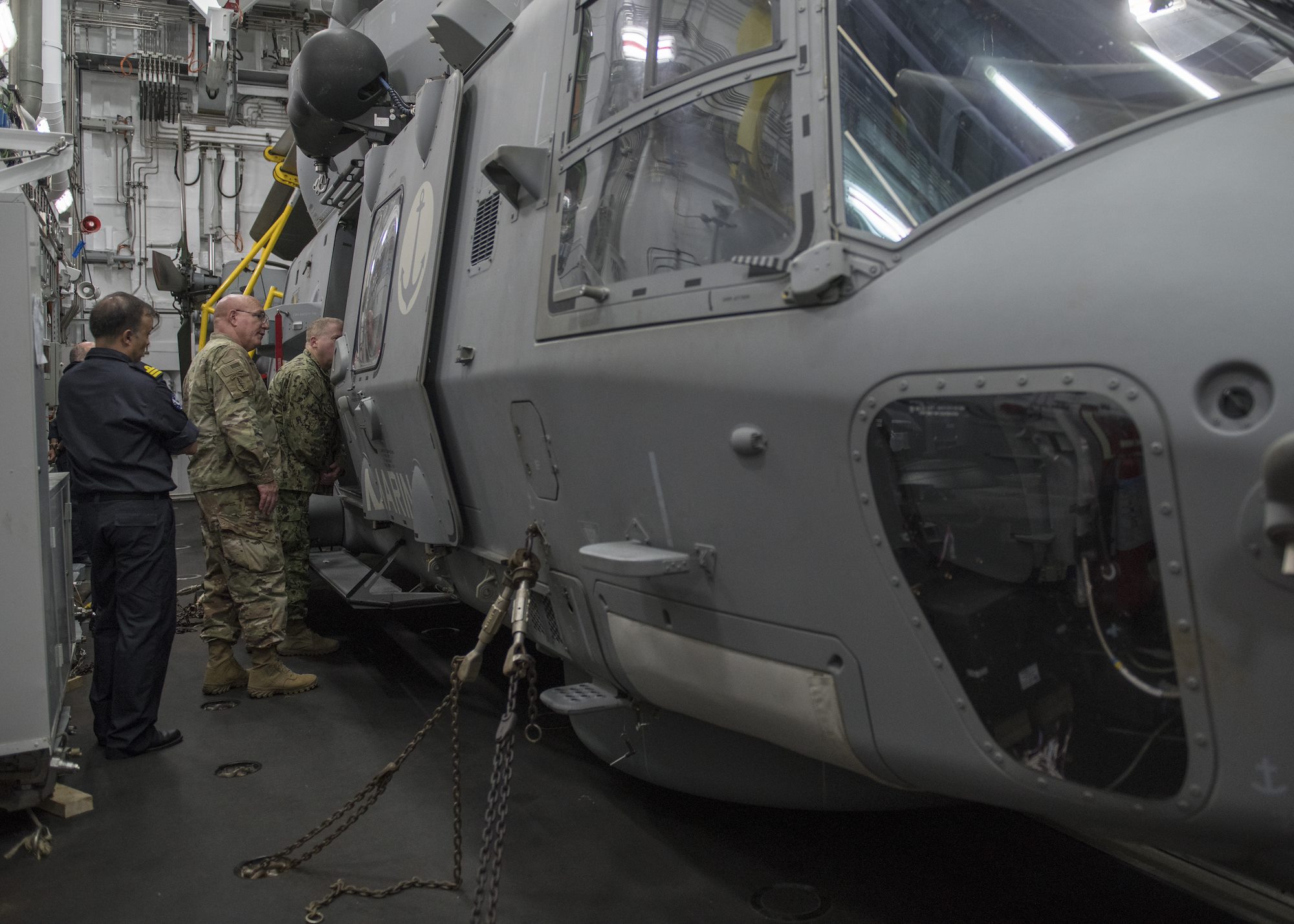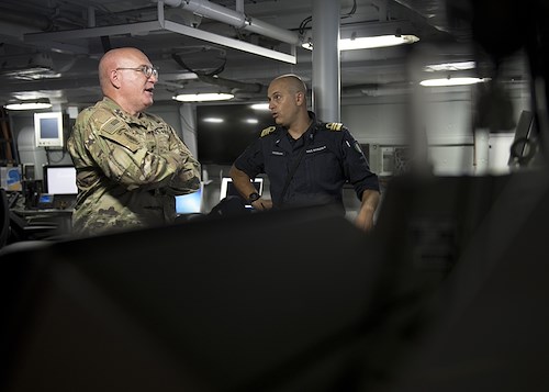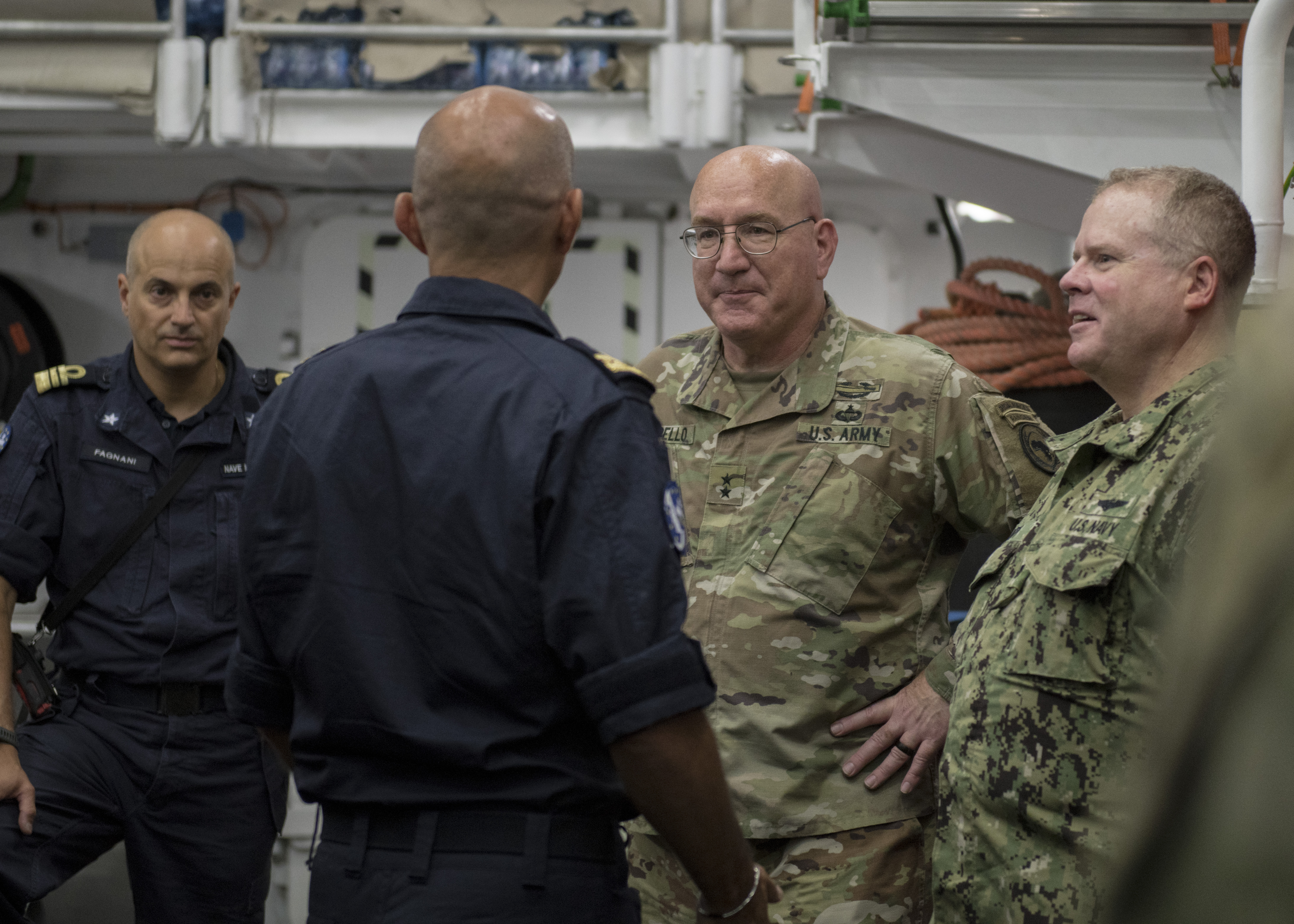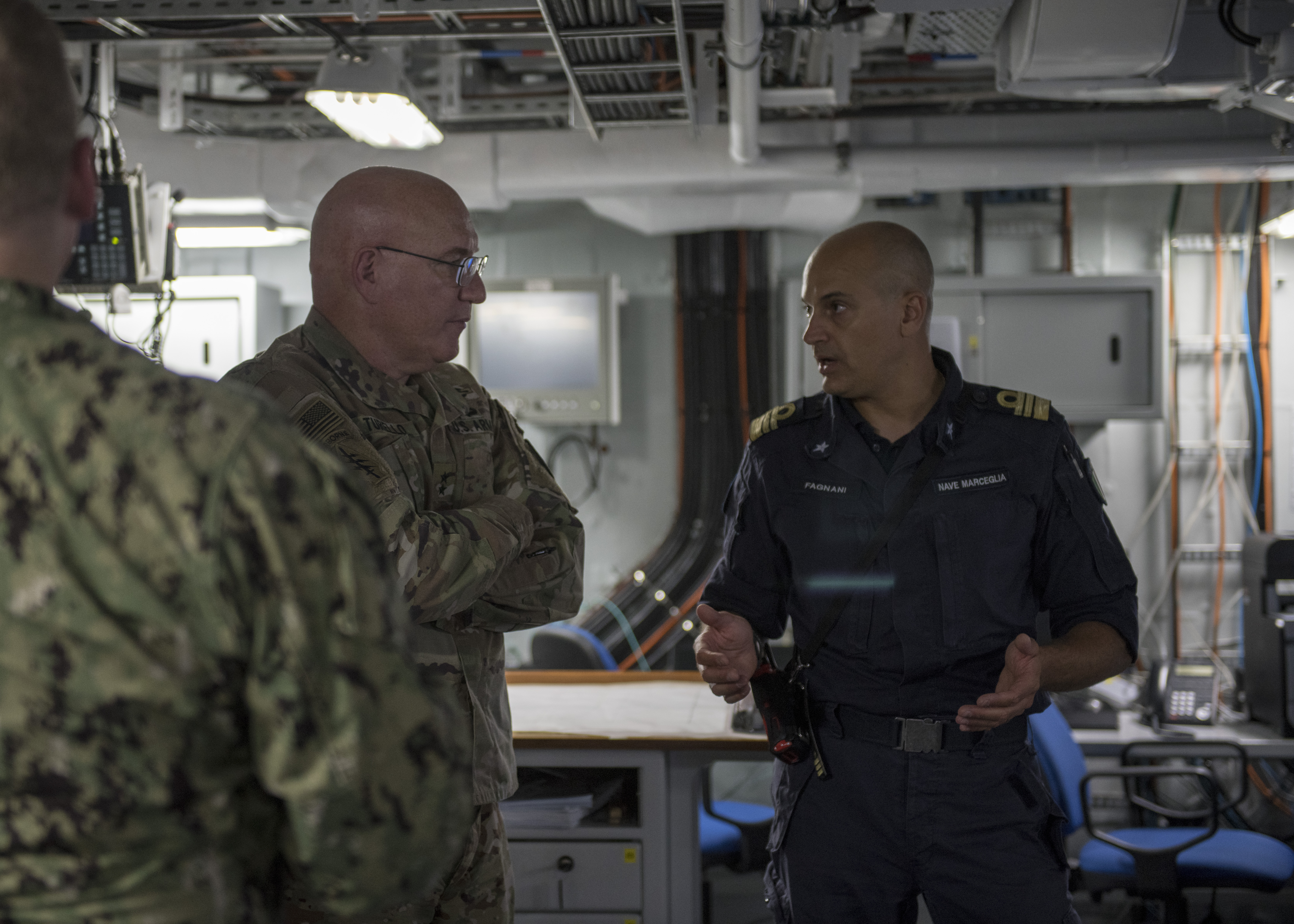 U.S. Army Maj. Gen. Michael D. Turello, commanding general of Combined Joint Task Force-Horn of Africa, receives a tour of ITS Antonio Marceglia, outside Djibouti City, Djibouti, Oct. 21, 2019. ITS Antonio Marceglia is the flagship of Operation Atalanta, a counter-piracy naval military operation off the Horn of Africa. (U.S. Air Force Photo by Senior Airman Codie Trimble)