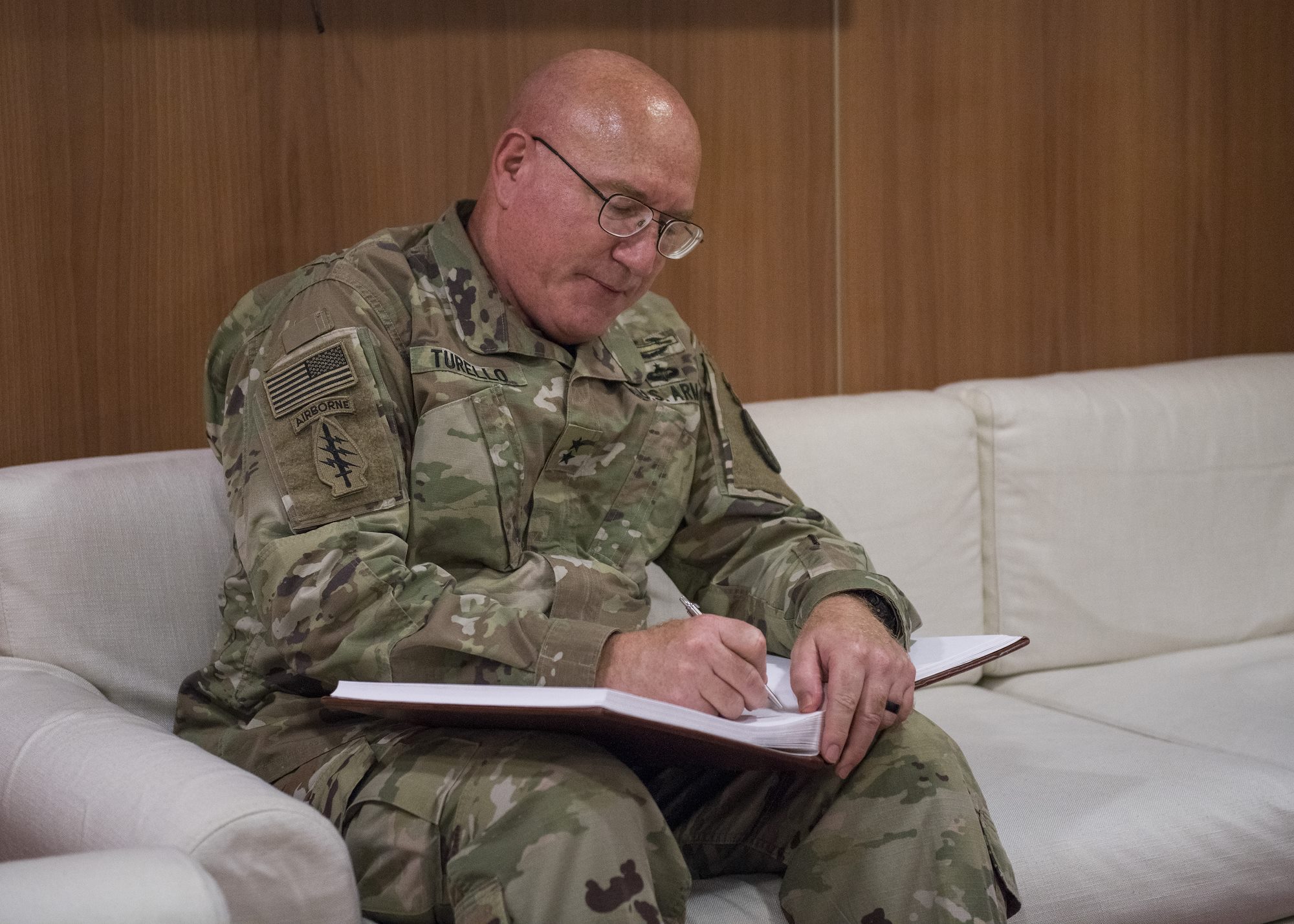 U.S. Army Maj. Gen. Michael D. Turello, commanding general of Combined Joint Task Force-Horn of Africa, signs the guest book on ITS Antonio Marceglia, outside Djibouti City, Djibouti, Oct. 21, 2019. ITS Antonio Marceglia is the flagship of Operation Atalanta, a counter-piracy naval military operation off the Horn of Africa. (U.S. Air Force Photo by Senior Airman Codie Trimble)
