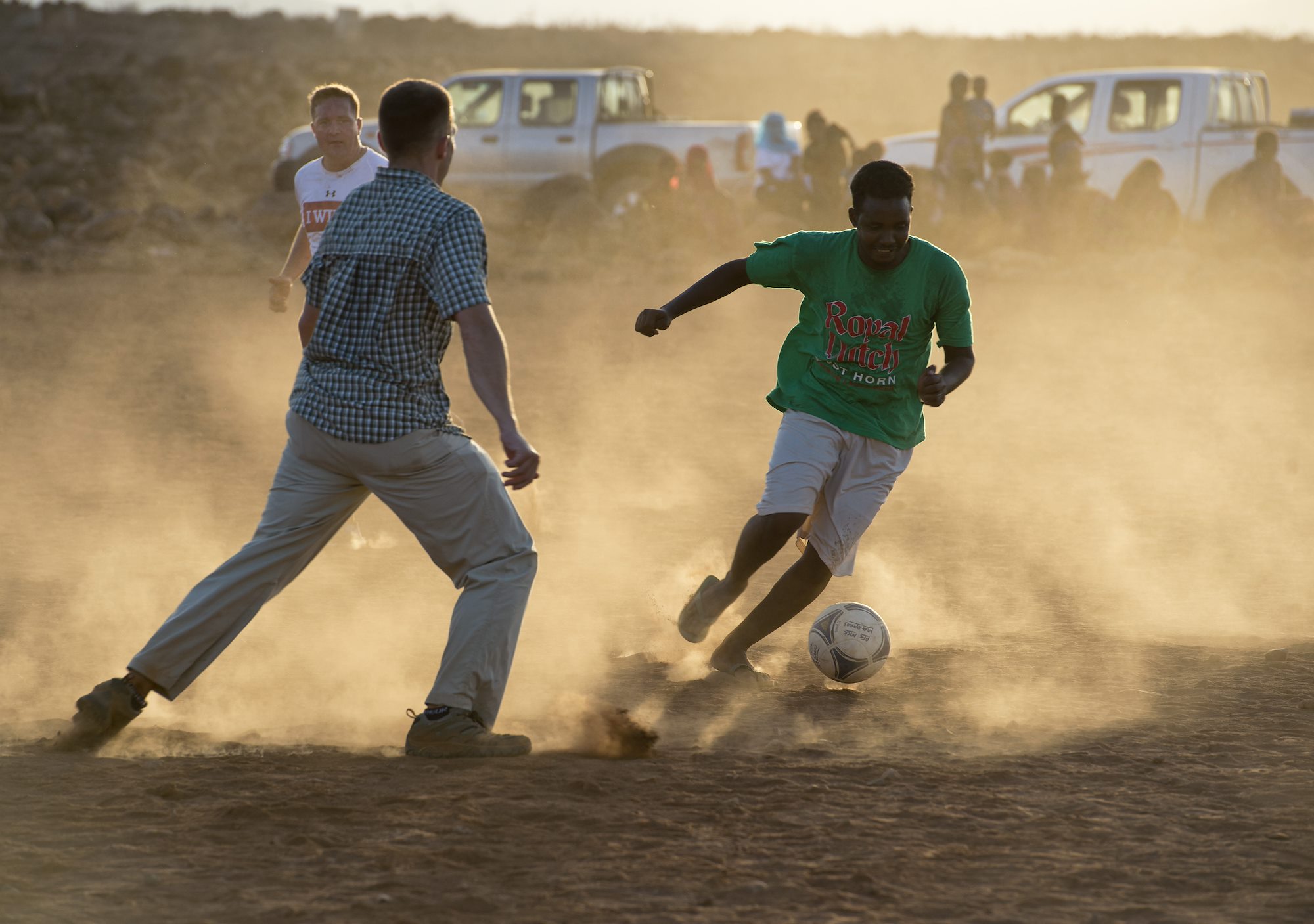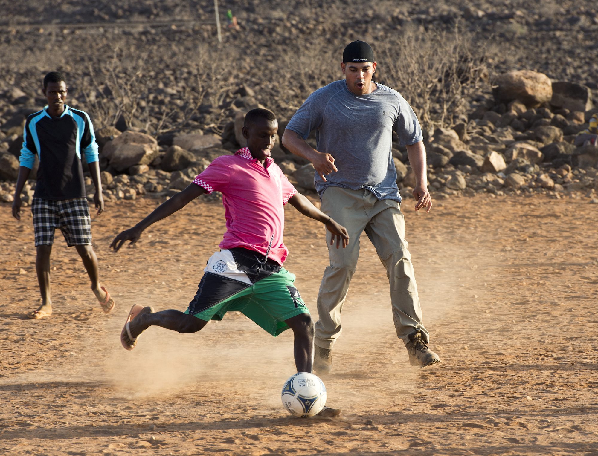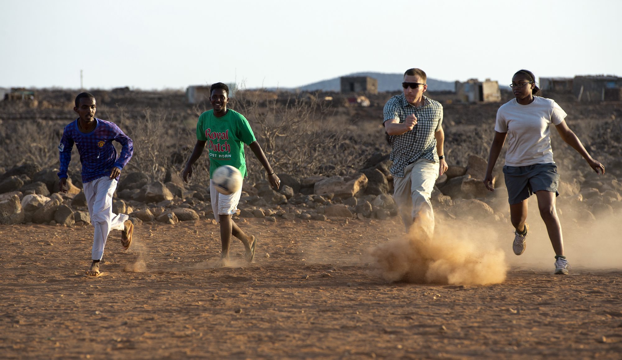 Personnel from Combined Joint Task Force-Horn of Africa joined with Chebelley Village residents to battle it out on the soccer field at Chebelley, Djibouti, April 29, 2015.