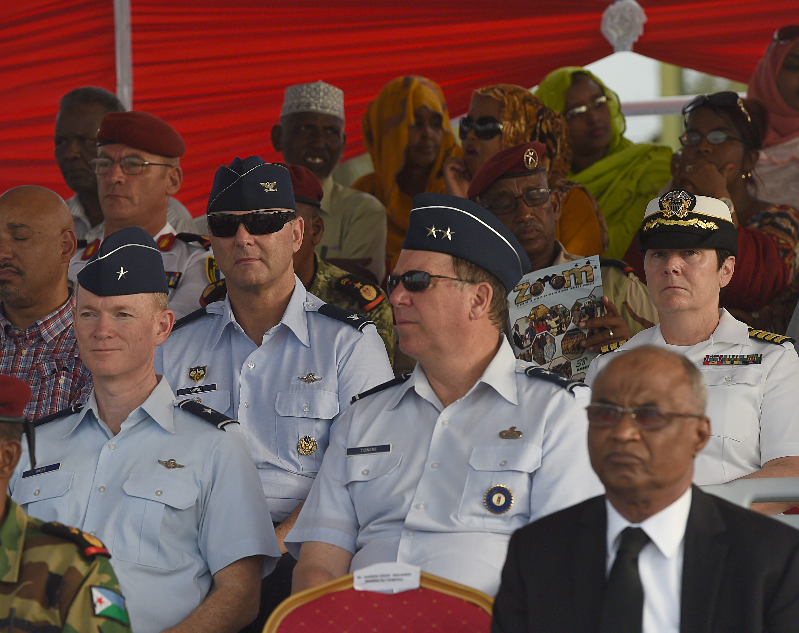 From left, William P. West, Combined Joint Task Force- Horn of Africa deputy commander, Col. James Kreisel, CJTF-HOA chief of staff, and Maj. Gen. Edward Tonini, Kentucky National Guard adjutant general, wait for the Djiboutian Armed Forces’ (FAD) 38th anniversary celebration to begin at Camp Cheik Osman, Djibouti, June 6, 2015. Tonini attended the event after representing the KNG in ratifying a state partnership agreement with the FAD days earlier. (U.S. Air Force photo by Senior Airman Nesha Humes)