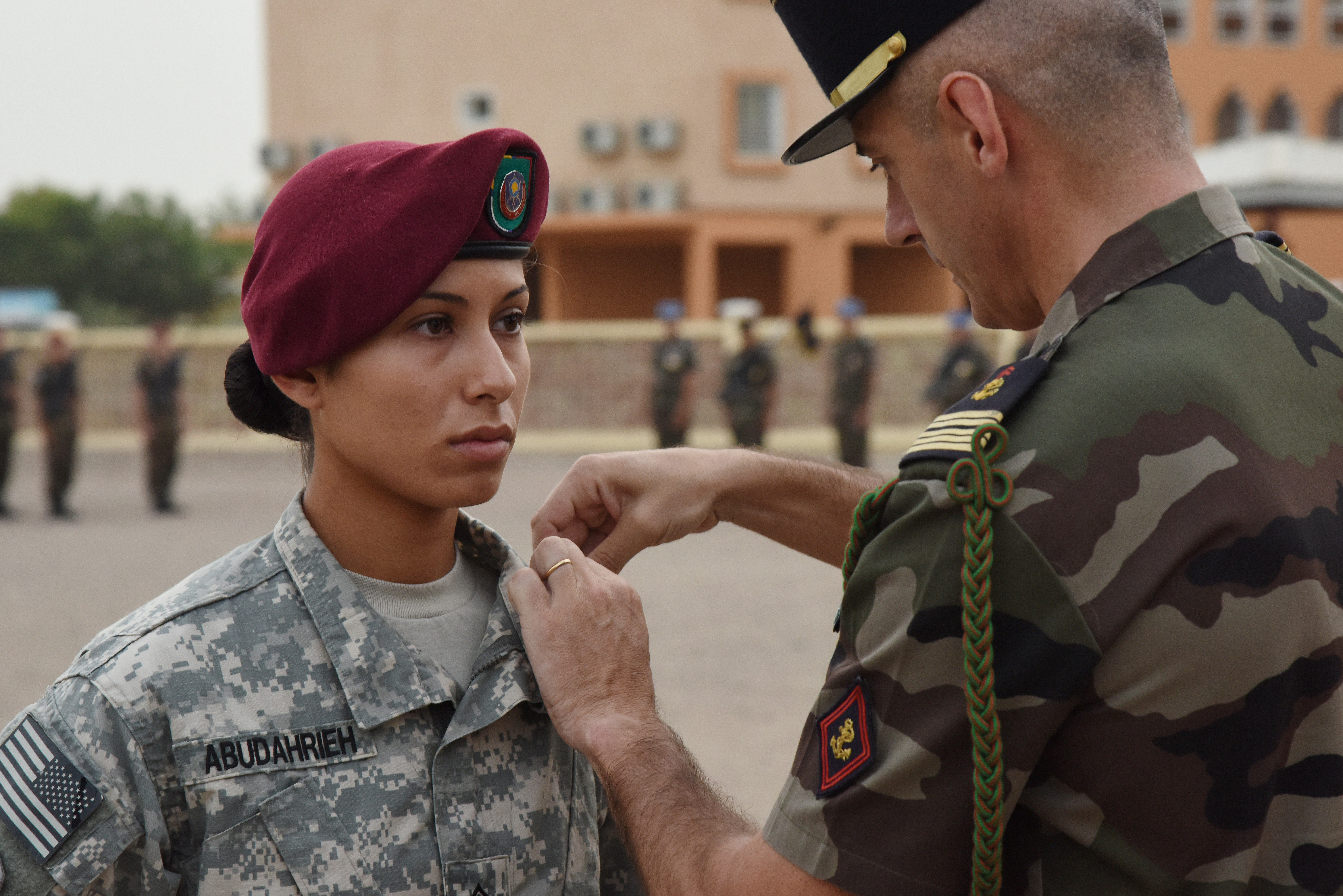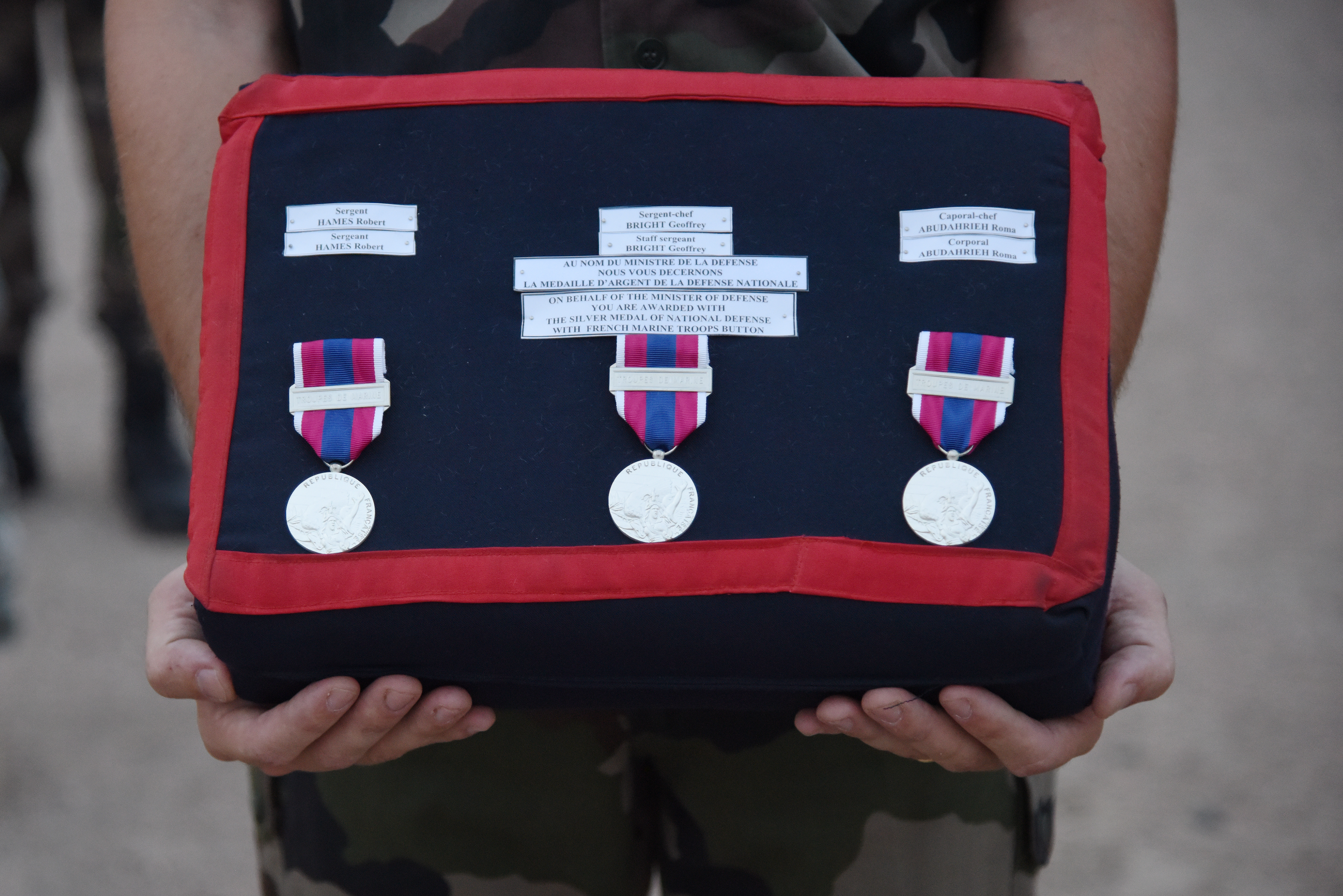 U.S. Army Sgt. Robert Hames, Sgt. Rawan Abudahrieh and Sgt. 1st Class Geoffrey Bright wait to receive a French National Defense Medal (Silver Level) June 11, 2015, for providing life-saving medical care to a French service member during a catastrophic motor vehicle accident in Feb., 2015. The French National Defense Medal, created in 1982, is awarded on three levels—bronze, silver and gold. It is rare for U.S. service members to receive this decoration, and general officers are the usual recipients. (U.S. Air Force photo by Staff Sgt. Maria Bowman)