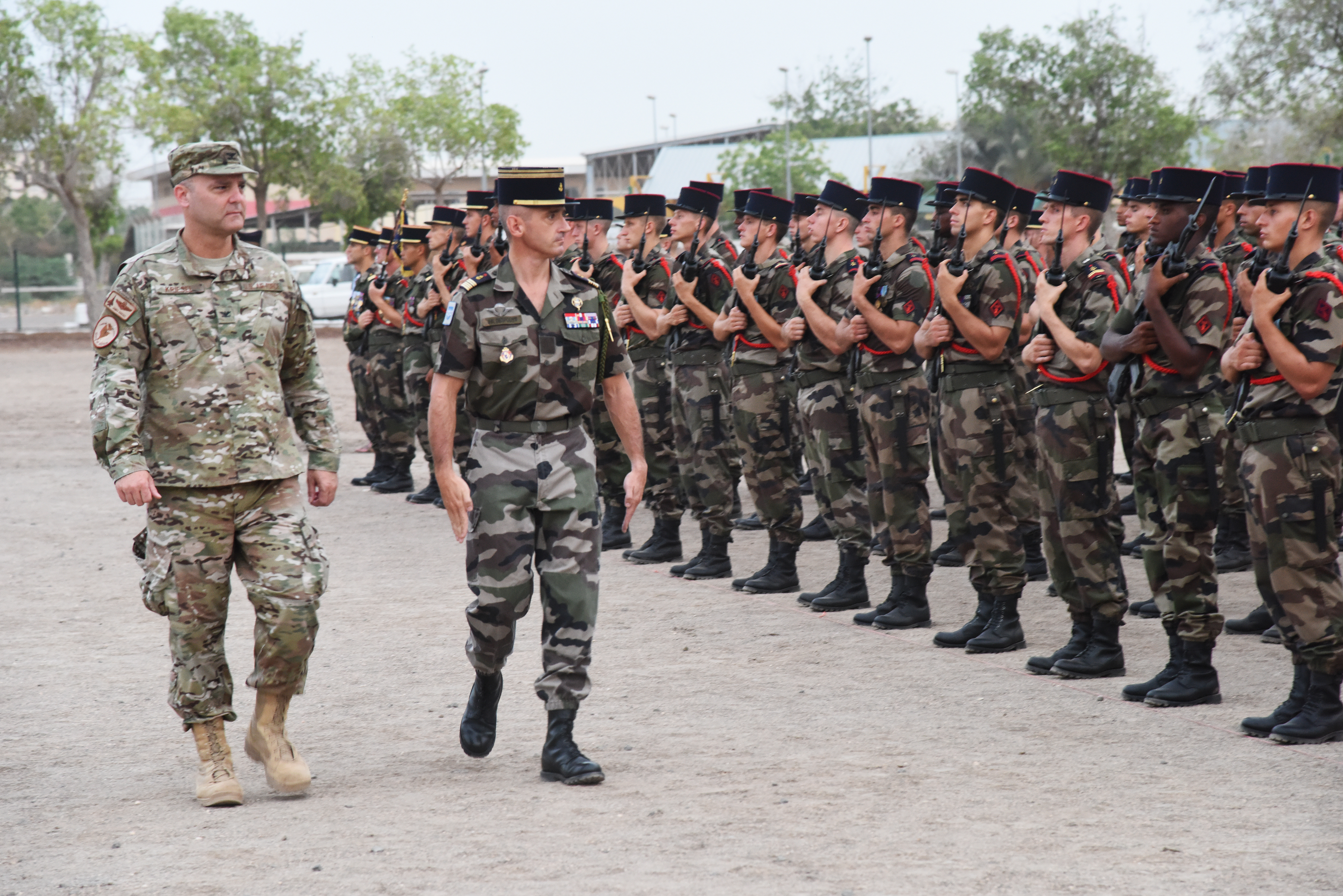U.S. Air Force Col. James Kriesel, Combined Joint Task Force-Horn of Africa chief of staff, and French Marine Col. Jean-Bruno Despouys, 5th Marines commanding officer, conduct a Pass and Review during a ceremony at a Naval base in Djibouti, June 11, 2015. During the ceremony, three U.S. Army personnel received a French National Defense Medal (Silver Level) for saving the life of a French service member during a motor vehicle accident Feb. 27, 2015. (U.S. Air Force photo by Staff Sgt. Maria Bowman)