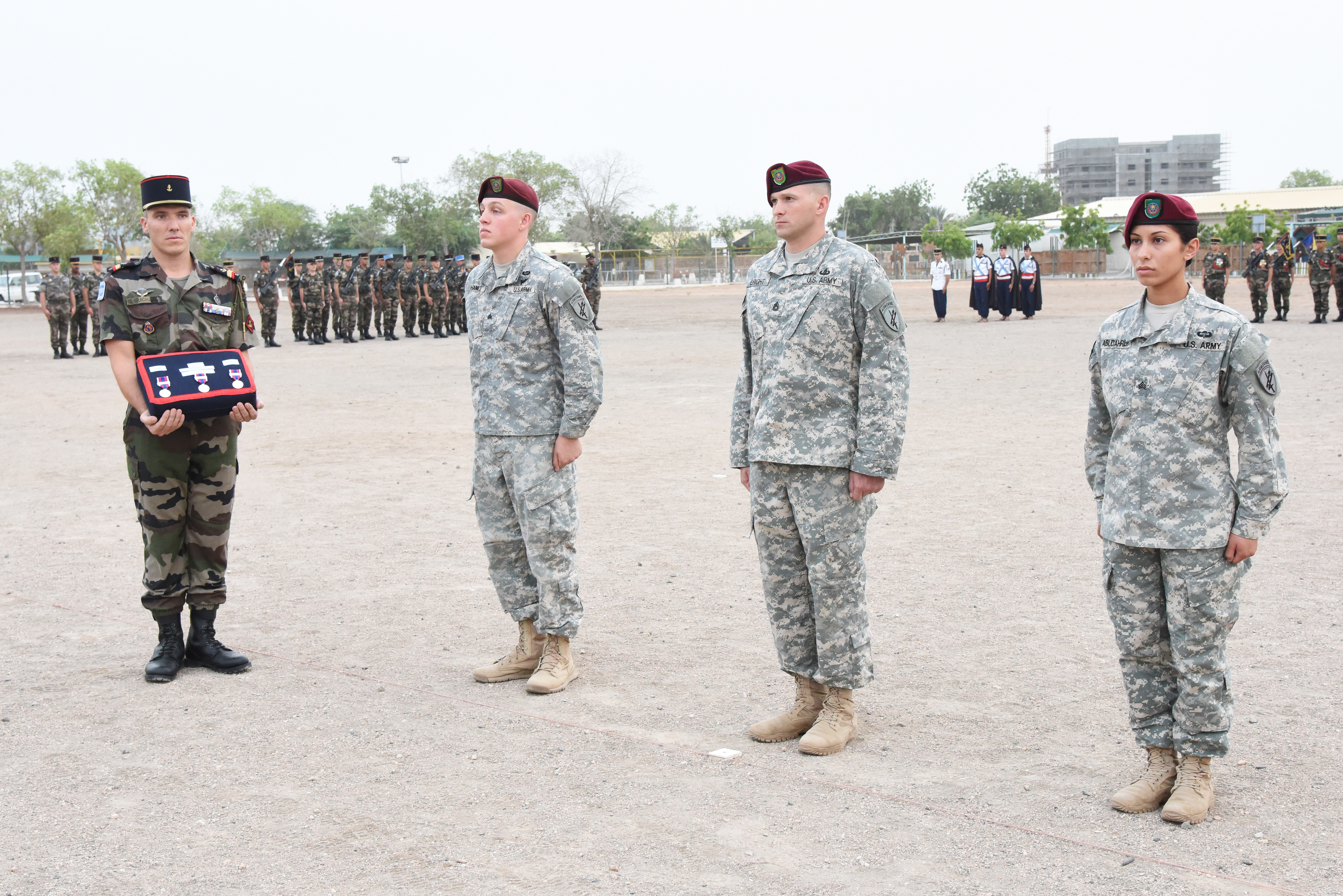 404th Civil Affairs Battalion members from Camp Lemonnier attend an award ceremony for three Army soldiers at a French naval base in Djibouti, June 11, 2015. The French National Defense Medal (Silver Level) recipients saved the life of a French service member during a motor vehicle accident Feb. 27, 2015. (U.S. Air Force photo by Staff Sgt. Maria Bowman)